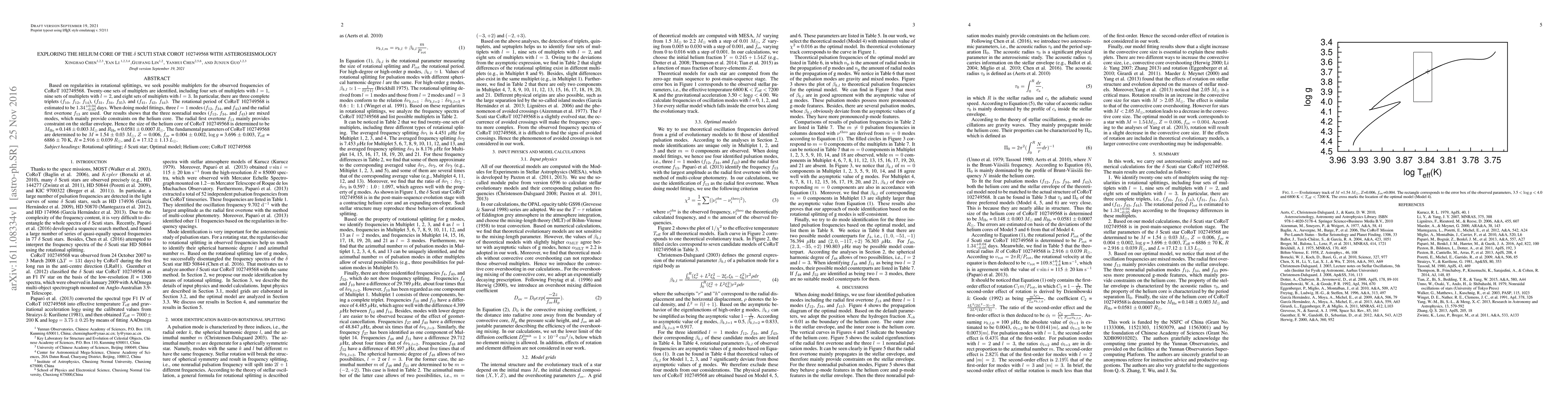 Based on regularities in rotational splittings, we seek possible multiplets for the observed frequencies of CoRoT 102749568. Twenty-one sets of multiplets are identified, including four sets of multiplets with $l=1$, nine sets of multiplets with $l=2$, and eight sets of multiplets with $l=3$. In particular, there are three complete triplets ($f_{10}$, $f_{12}$, $f_{14}$), ($f_{31}$, $f_{34}$, $f_{35}$), and ($f_{41}$, $f_{43}$, $f_{44}$). The rotational period of CoRoT 102749568 is estimated to be $1.34^{+0.04}_{-0.05}$ days. When doing model fittings, three $l=1$ modes ($f_{12}$, $f_{34}$, and $f_{43}$) and the radial first overtone $f_{13}$ are used. Our results shows that the three nonradial modes ($f_{12}$, $f_{34}$, and $f_{43}$) are mixed modes, which mainly provide constraints on the helium core. The radial first overtone $f_{13}$ mainly provides constraint on the stellar envelope. Hence the size of the helium core of CoRoT 102749568 is determined to be $M_{\rm He}$ = 0.148 $\pm$ 0.003 $M_{\odot}$ and $R_{\rm He}$ = 0.0581 $\pm$ 0.0007 $R_{\odot}$. The fundamental parameters of CoRoT 102749568 are determined to be $M$ = 1.54 $\pm$ 0.03 $M_{\odot}$, $Z=$ 0.006, $f_{\rm ov}$ = 0.004 $\pm$ 0.002, $\log g$ = 3.696 $\pm$ 0.003, $T_{\rm eff}$ = 6886 $\pm$ 70 K, $R$ = 2.916 $\pm$ 0.039 $R_{\odot}$, and $L$ = 17.12 $\pm$ 1.13 $L_{\odot}$.