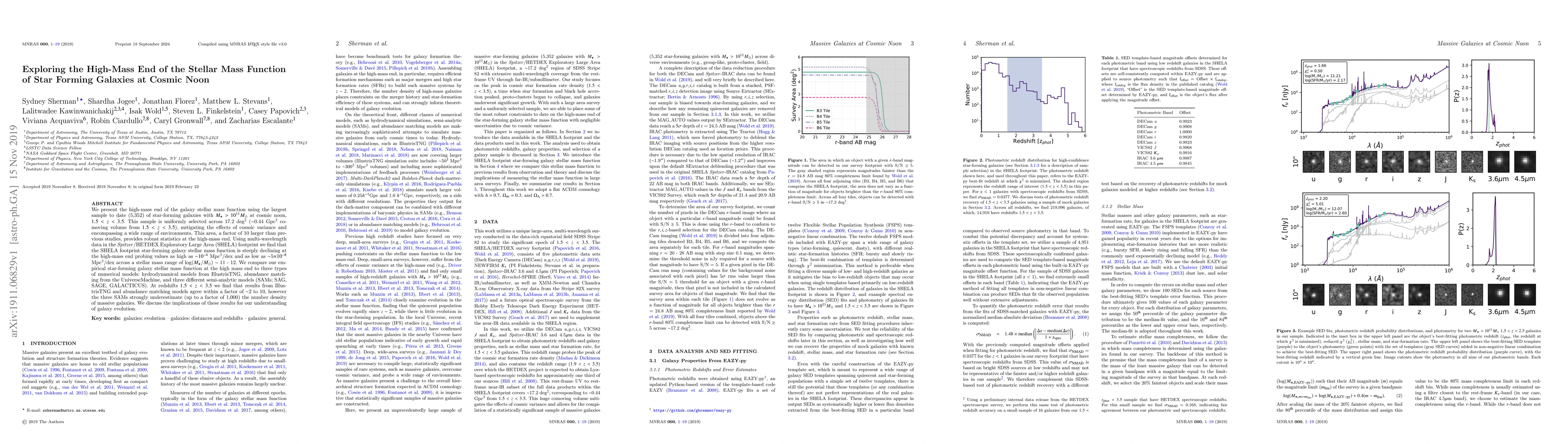 We present the high-mass end of the galaxy stellar mass function using the largest sample to date (5,352) of star-forming galaxies with $M_{\star} > 10^{11} M_{\odot}$ at cosmic noon, $1.5 < z < 3.5$. This sample is uniformly selected across 17.2 deg$^2$ ($\sim$0.44 Gpc$^3$ comoving volume from $1.5 < z < 3.5$), mitigating the effects of cosmic variance and encompassing a wide range of environments. This area, a factor of 10 larger than previous studies, provides robust statistics at the high-mass end. Using multi-wavelength data in the Spitzer/HETDEX Exploratory Large Area (SHELA) footprint we find that the SHELA footprint star-forming galaxy stellar mass function is steeply declining at the high-mass end probing values as high as $\sim$$10^{-4}$ Mpc$^3$/dex and as low as $\sim$5$\times$$10^{-8}$ Mpc$^3$/dex across a stellar mass range of log($M_\star$/$M_\odot$) $\sim$ 11 - 12. We compare our empirical star-forming galaxy stellar mass function at the high mass end to three types of numerical models: hydrodynamical models from IllustrisTNG, abundance matching from the UniverseMachine, and three different semi-analytic models (SAMs; SAG, SAGE, GALACTICUS). At redshifts $1.5 < z < 3.5$ we find that results from IllustrisTNG and abundance matching models agree within a factor of $\sim$2 to 10, however the three SAMs strongly underestimate (up to a factor of 1,000) the number density of massive galaxies. We discuss the implications of these results for our understanding of galaxy evolution.