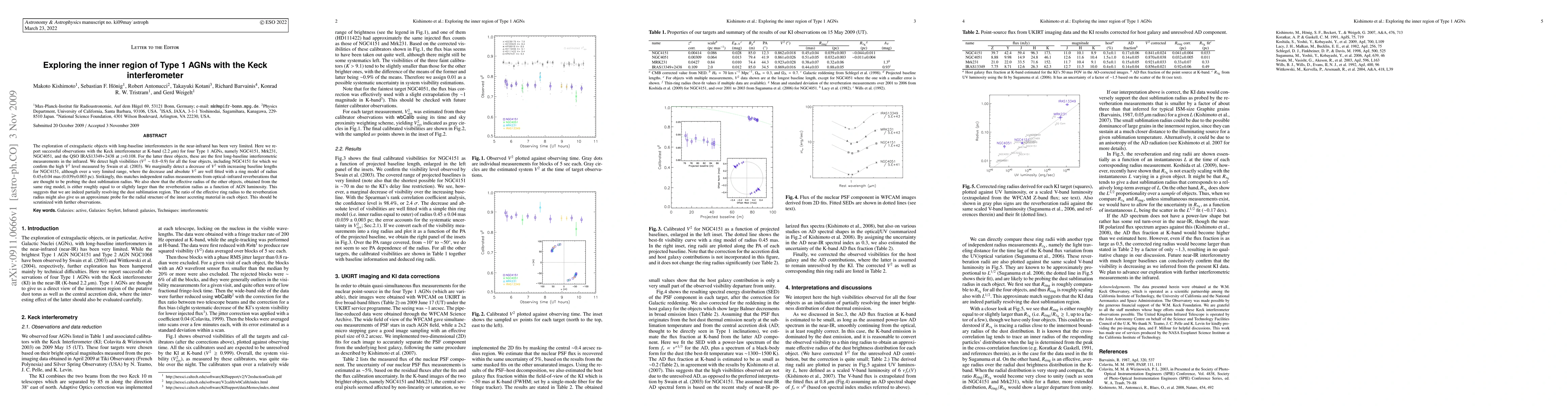 The exploration of extragalactic objects with long-baseline interferometers in the near-infrared has been very limited. Here we report successful observations with the Keck interferometer at K-band (2.2 um) for four Type 1 AGNs, namely NGC4151, Mrk231, NGC4051, and the QSO IRAS13349+2438 at z=0.108. For the latter three objects, these are the first long-baseline interferometric measurements in the infrared. We detect high visibilities (V^2 ~ 0.8-0.9) for all the four objects, including NGC4151 for which we confirm the high V^2 level measured by Swain et al.(2003). We marginally detect a decrease of V^2 with increasing baseline lengths for NGC4151, although over a very limited range, where the decrease and absolute V^2 are well fitted with a ring model of radius 0.45+/-0.04 mas (0.039+/-0.003 pc). Strikingly, this matches independent radius measurements from optical--infrared reverberations that are thought to be probing the dust sublimation radius. We also show that the effective radius of the other objects, obtained from the same ring model, is either roughly equal to or slightly larger than the reverberation radius as a function of AGN luminosity. This suggests that we are indeed partially resolving the dust sublimation region. The ratio of the effective ring radius to the reverberation radius might also give us an approximate probe for the radial structure of the inner accreting material in each object. This should be scrutinized with further observations.