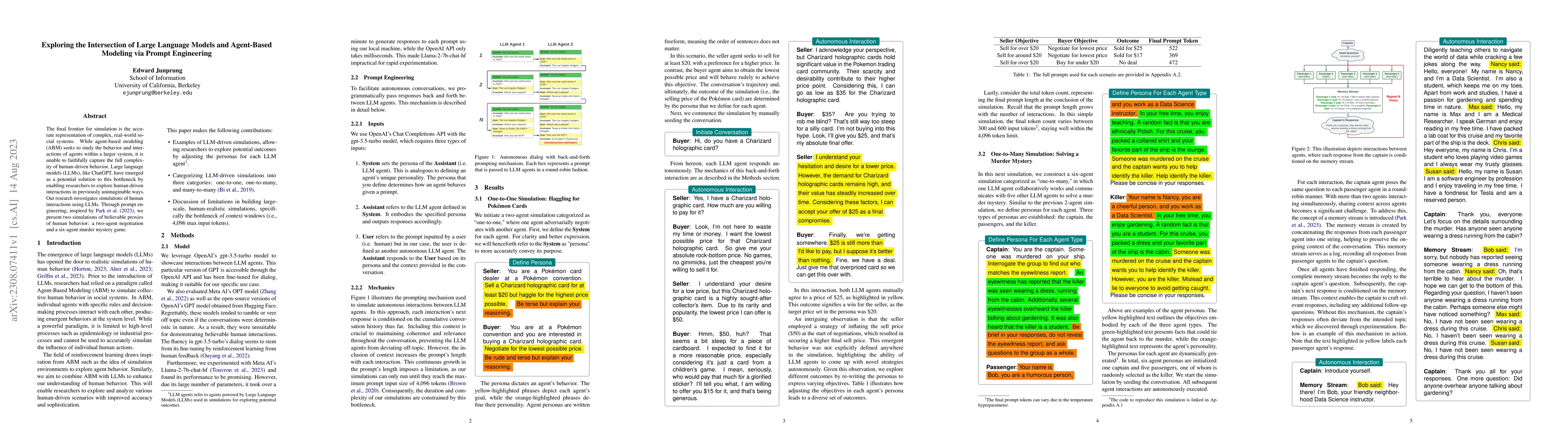 This research explores the integration of large language models (LLMs) with agent-based modeling (ABM) to simulate complex human-driven interactions. By employing prompt engineering, the study demonstrates two simulations showcasing human-like behavior in negotiation and a murder mystery game.