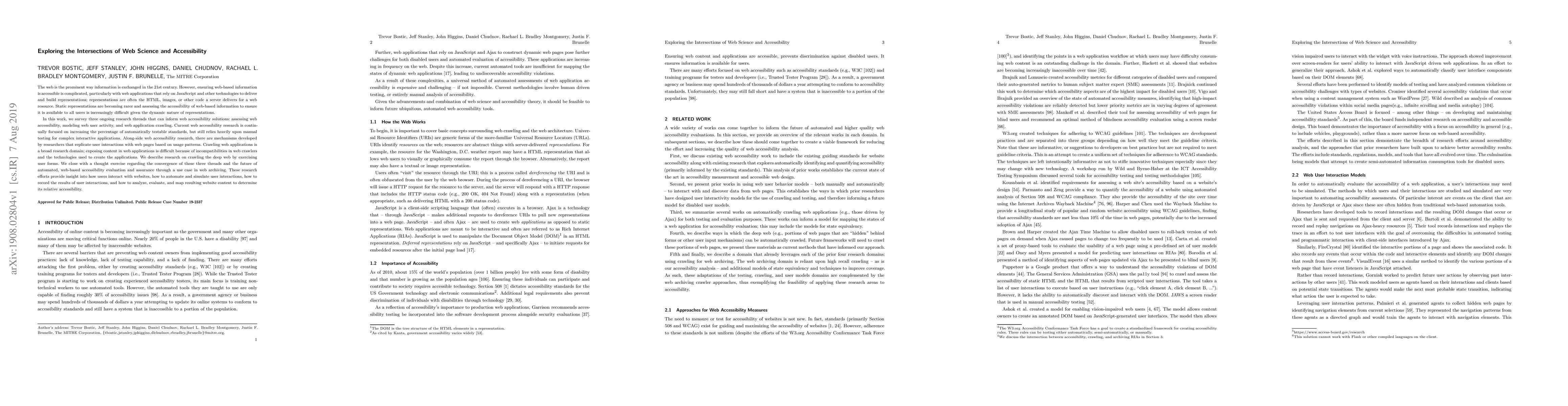The web is the prominent way information is exchanged in the 21st century. However, ensuring web-based information is accessible is complicated, particularly with web applications that rely on JavaScript and other technologies to deliver and build representations; representations are often the HTML, images, or other code a server delivers for a web resource. Static representations are becoming rarer and assessing the accessibility of web-based information to ensure it is available to all users is increasingly difficult given the dynamic nature of representations. In this work, we survey three ongoing research threads that can inform web accessibility solutions: assessing web accessibility, modeling web user activity, and web application crawling. Current web accessibility research is continually focused on increasing the percentage of automatically testable standards, but still relies heavily upon manual testing for complex interactive applications. Along-side web accessibility research, there are mechanisms developed by researchers that replicate user interactions with web pages based on usage patterns. Crawling web applications is a broad research domain; exposing content in web applications is difficult because of incompatibilities in web crawlers and the technologies used to create the applications. We describe research on crawling the deep web by exercising user forms. We close with a thought exercise regarding the convergence of these three threads and the future of automated, web-based accessibility evaluation and assurance through a use case in web archiving. These research efforts provide insight into how users interact with websites, how to automate and simulate user interactions, how to record the results of user interactions, and how to analyze, evaluate, and map resulting website content to determine its relative accessibility.
