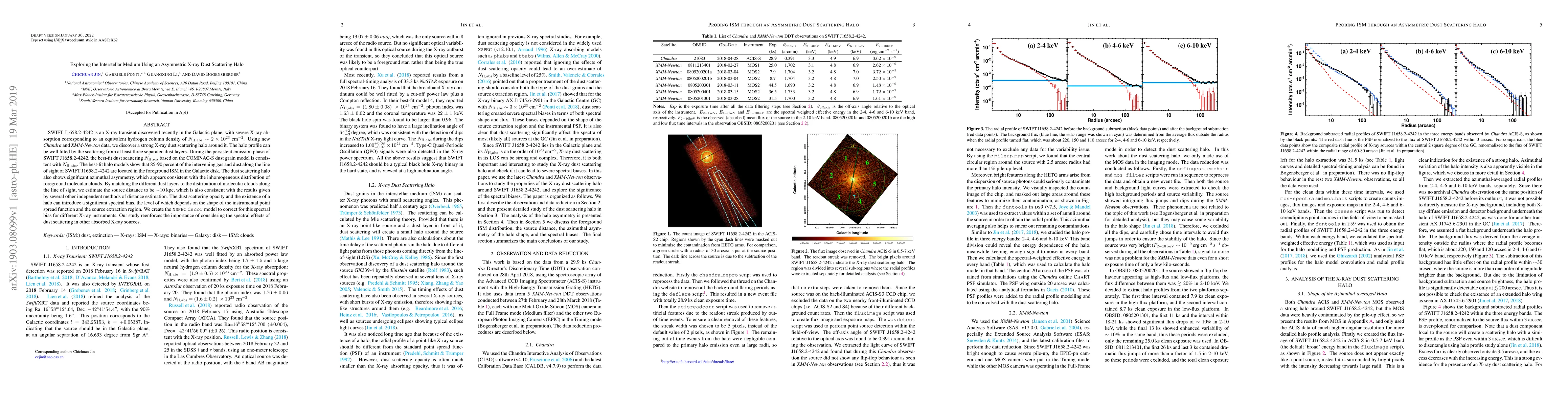 This paper investigates the X-ray transient SWIFT J1658.2-4242 using Chandra and XMM-Newton data, revealing a strong scattering halo from multiple dust layers. The study estimates the source distance to be around 10 kpc and highlights the need to correct for spectral biases introduced by dust scattering in X-ray observations.
