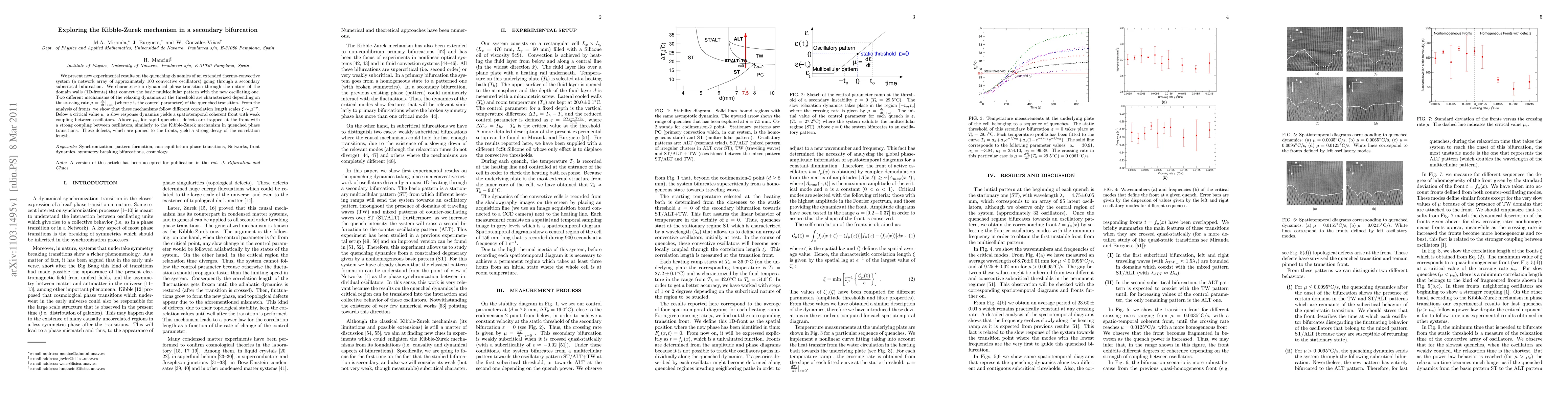 We present new experimental results on the quenching dynamics of an extended thermo-convective system (a network array of approximately 100 convective oscillators) going through a secondary subcritical bifurcation. We characterize a dynamical phase transition through the nature of the domain walls (1D-fronts) that connect the basic multicellular pattern with the new oscillating one. Two different mechanisms of the relaxing dynamics at the threshold are characterized depending on the crossing rate $\mu=\frac{d\epsilon}{dt}|_{\epsilon=0}$ (where $\epsilon$ is the control parameter) of the quenched transition. From the analysis of fronts, we show that these mechanisms follow different correlation length scales $\xi \sim \mu^{-\sigma}$. Below a critical value $\mu_c$ a slow response dynamics yields a spatiotemporal coherent front with weak coupling between oscillators. Above $\mu_c$, for rapid quenches, defects are trapped at the front with a strong coupling between oscillators, similarly to the Kibble-Zurek mechanism in quenched phase transitions. These defects, which are pinned to the fronts, yield a strong decay of the correlation length.
