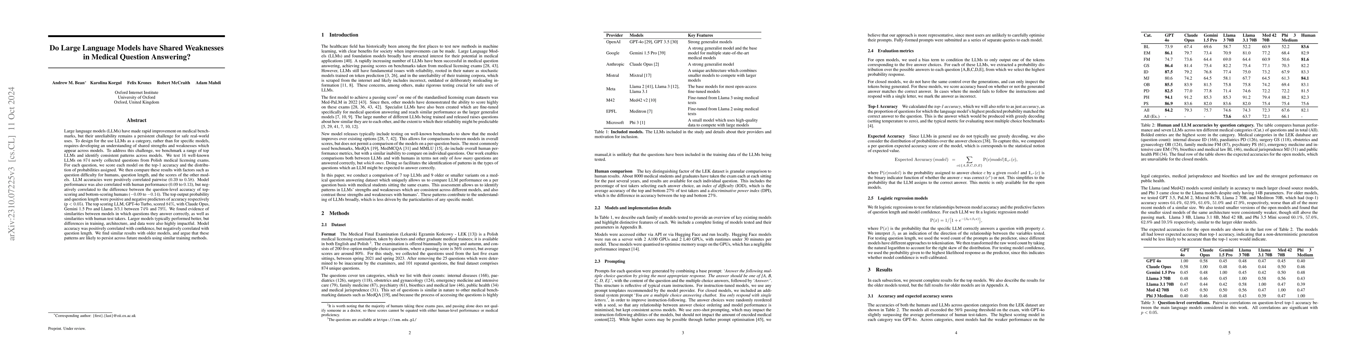 This study benchmarks eight leading large language models (LLMs) on medical questions from Polish licensing exams, revealing that while LLM accuracies are positively correlated, they also correlate weakly with human performance. GPT-4 Turbo achieved the highest accuracy at 82%, with larger models generally outperforming smaller ones. The research highlights consistent patterns in model performance, indicating that model confidence and question length significantly influence accuracy.