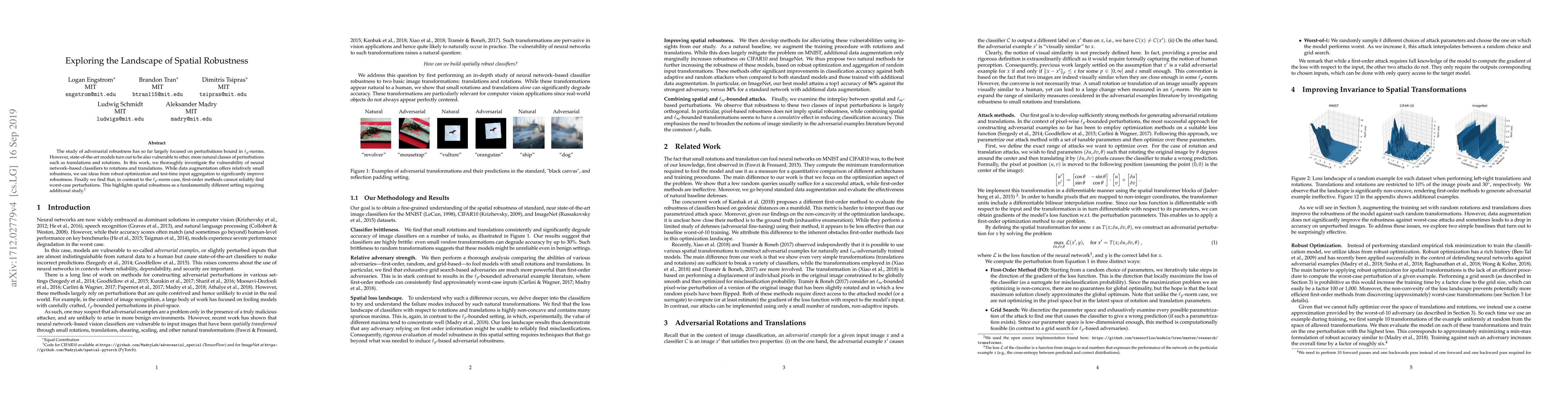 The study of adversarial robustness has so far largely focused on perturbations bound in p-norms. However, state-of-the-art models turn out to be also vulnerable to other, more natural classes of perturbations such as translations and rotations. In this work, we thoroughly investigate the vulnerability of neural network--based classifiers to rotations and translations. While data augmentation offers relatively small robustness, we use ideas from robust optimization and test-time input aggregation to significantly improve robustness. Finally we find that, in contrast to the p-norm case, first-order methods cannot reliably find worst-case perturbations. This highlights spatial robustness as a fundamentally different setting requiring additional study. Code available at https://github.com/MadryLab/adversarial_spatial and https://github.com/MadryLab/spatial-pytorch.