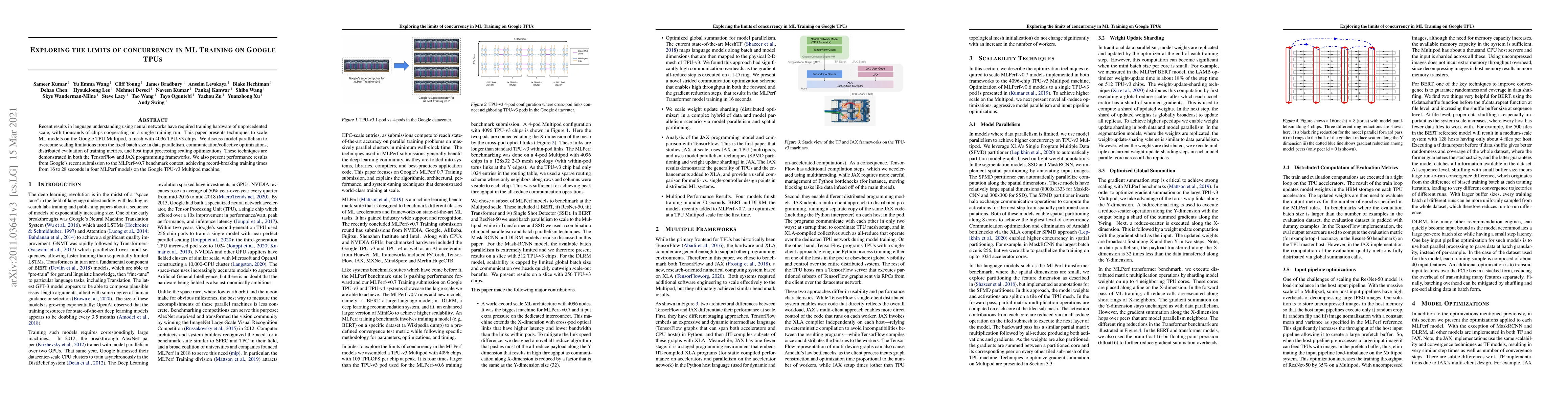 Recent results in language understanding using neural networks have required training hardware of unprecedentedscale, with thousands of chips cooperating on a single training run. This paper presents techniques to scaleML models on the Google TPU Multipod, a mesh with 4096 TPU-v3 chips. We discuss model parallelism toovercome scaling limitations from the fixed batch size in data parallelism, communication/collective optimizations,distributed evaluation of training metrics, and host input processing scaling optimizations. These techniques aredemonstrated in both the TensorFlow and JAX programming frameworks. We also present performance resultsfrom the recent Google submission to the MLPerf-v0.7 benchmark contest, achieving record training times from16 to 28 seconds in four MLPerf models on the Google TPU-v3 Multipod machine.