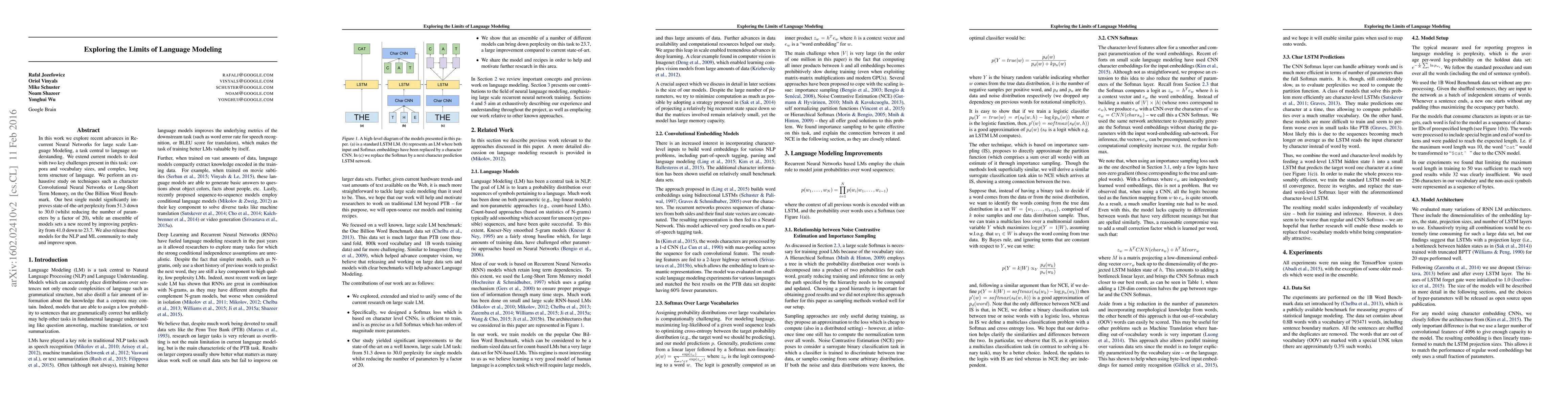 In this work we explore recent advances in Recurrent Neural Networks for large scale Language Modeling, a task central to language understanding. We extend current models to deal with two key challenges present in this task: corpora and vocabulary sizes, and complex, long term structure of language. We perform an exhaustive study on techniques such as character Convolutional Neural Networks or Long-Short Term Memory, on the One Billion Word Benchmark. Our best single model significantly improves state-of-the-art perplexity from 51.3 down to 30.0 (whilst reducing the number of parameters by a factor of 20), while an ensemble of models sets a new record by improving perplexity from 41.0 down to 23.7. We also release these models for the NLP and ML community to study and improve upon.