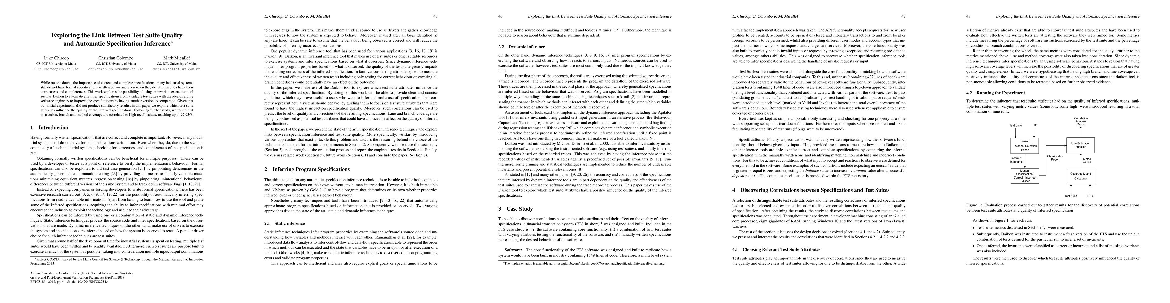 This research investigates the relationship between test suite quality and automatic specification inference using Daikon tool. It reveals that instruction, branch, and method coverage significantly correlate with high recall values in inferred specifications, up to 97.93%, aiding engineers in improving specifications.