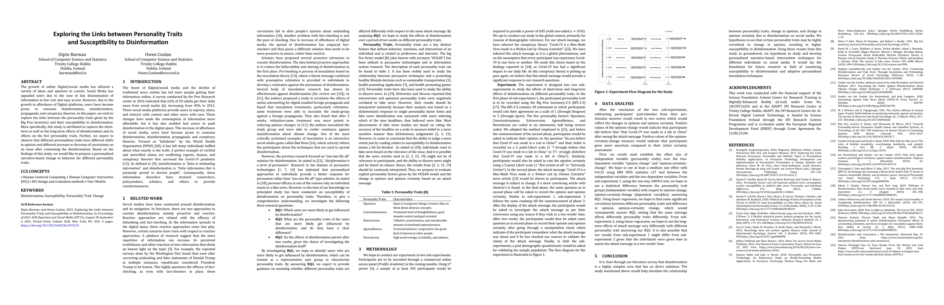 This paper investigates the relationship between personality traits identified by the Big Five Inventory and susceptibility to disinformation. It aims to capture both short-term and long-term effects of disinformation on these traits, expecting different personality types to exhibit varying shifts in opinion and uncertainty levels post-exposure.
