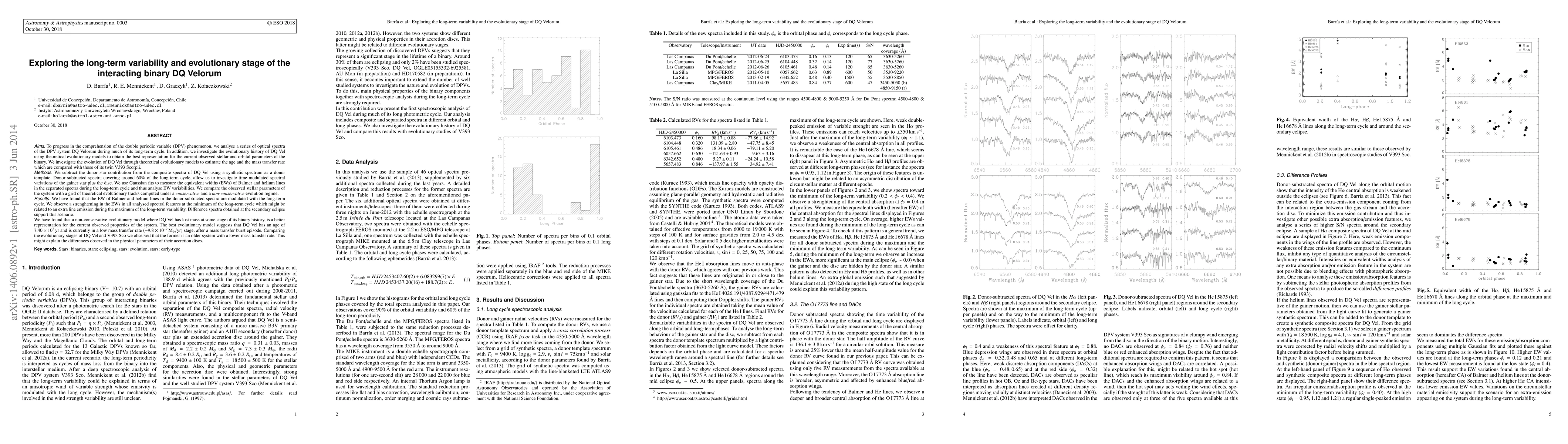 To progress in the comprehension of the double periodic variable (DPV) phenomenon, we analyse a series of optical spectra of the DPV system DQ Velorum during much of its long-term cycle. In addition, we investigate the evolutionary history of DQ Vel using theoretical evolutionary models to obtain the best representation for the current observed stellar and orbital parameters of the binary. We investigate the evolution of DQ Vel through theoretical evolutionary models to estimate the age and the mass transfer rate which are compared with those of its twin V393 Scorpii. Donor subtracted spectra covering around 60% of the long-term cycle, allow us to investigate time-modulated spectral variations of the gainer star plus the disc. We compare the observed stellar parameters of the system with a grid of theoretical evolutionary tracks computed under a conservative and a non-conservative evolution regime. We have found that the EW of Balmer and helium lines in the donor subtracted spectra are modulated with the long-term cycle. We observe a strenghtening in the EWs in all analysed spectral features at the minimum of the long-term cycle which might be related to an extra line emission during the maximum of the long-term variability. Difference spectra obtained at the secondary eclipse support this scenario. We have found that a non-conservative evolutionary model is a better representation for the current observed properties of the system. The best evolutionary model suggests that DQ Vel has an age of 7.40 x 10^{7} yr and is currently in a low mass transfer rate (-9.8x10^{-9} Msun/yr) stage, after a mass transfer burst episode. Comparing the evolutionary stages of DQ Vel and V393 Sco we observed that the former is an older system with a lower mass transfer rate. This might explain the differences observed in the physical parameters of their accretion discs.