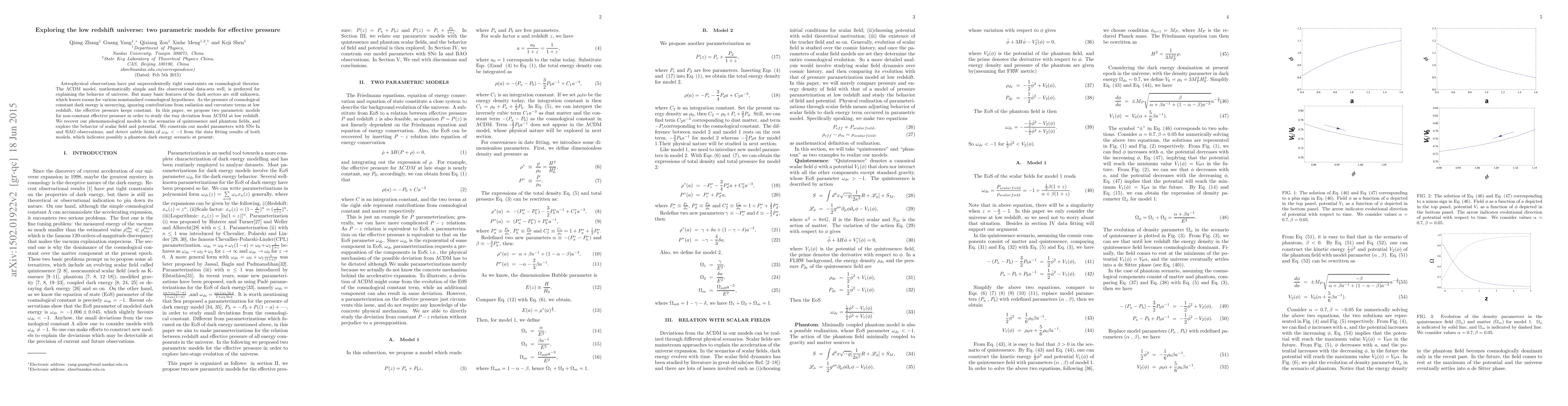 Astrophysical observations have put unprecedentedly tight constraints on cosmological theories. The $\Lambda$CDM model, mathematically simple and fits observational data-sets well, is preferred for explaining the behavior of universe. But many basic features of the dark sectors are still unknown, which leaves rooms for various nonstandard cosmological hypotheses. As the pressure of cosmological constant dark energy is unvarying, ignoring contributions from radiation and curvature terms at low redshift, the effective pressure keeps constant. In this paper, we propose two parametric models for non-constant effective pressure in order to study the tiny deviation from $\Lambda$CDM at low redshift. We recover our phenomenological models in the scenarios of quintessence and phantom fields, and explore the behavior of scalar field and potential. We constrain our model parameters with SNe Ia and BAO observations, and detect subtle hints of $\omega_{de}<-1$ from the data fitting results of both models, which indicates possibly a phantom dark energy scenario at present.