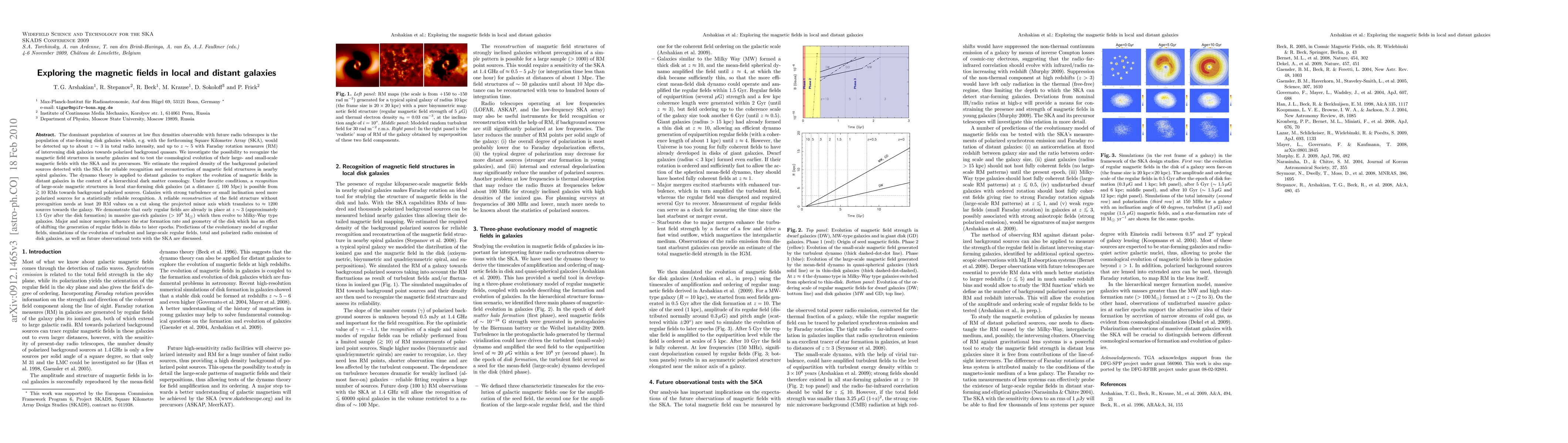 (abridged) We investigate the possibility to recognize the magnetic field structures in nearby galaxies and to test the cosmological evolution of their large- and small-scale magnetic fields with the SKA and its precursors. We estimate the required density of the background polarized sources detected with the SKA for reliable reconstruction and reconstruction of magnetic field structures in nearby spiral galaxies. The dynamo theory is applied to distant galaxies to explore the evolution of magnetic fields in distant galaxies in the context of a hierarchical dark matter cosmology. Under favorite conditions, a \emph{recognition} of large-scale magnetic structures in local star-forming disk galaxies (at a distance $\la 100$ Mpc) is possible from $\ga 10$ RMs towards background polarized sources. Galaxies with strong turbulence or small inclination need more polarized sources for a statistically reliable recognition. A reliable \emph{reconstruction} of the field structure without precognition needs at least 20 RM values on a cut along the projected minor axis which translates to $\approx1200$ sources towards the galaxy. We demonstrate that early regular fields are already in place at $z \sim 4$ (approximately 1.5 Gyr after the disk formation) in massive gas-rich galaxies ($>10^9$ M$_{\sun}$) which then evolve to Milky-Way type galaxies. Major and minor mergers influence the star formation rate and geometry of the disk which has an effect of shifting the generation of regular fields in disks to later epochs. Predictions of the evolutionary model of regular fields, simulations of the evolution of turbulent and large-scale regular fields, total and polarized radio emission of disk galaxies, as well as future observational tests with the SKA are discussed.