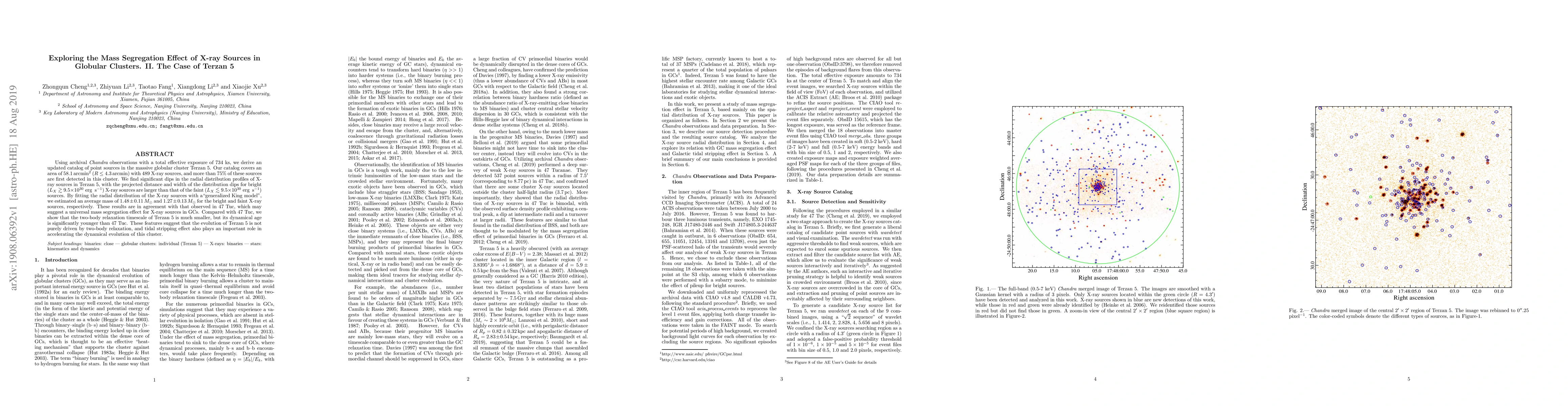 This study uses {\it Chandra} observations to analyze X-ray sources in the globular cluster Terzan 5, revealing significant mass segregation with brighter sources showing larger distribution dips. The findings suggest a universal mass segregation effect similar to 47 Tuc, but indicate that Terzan 5's evolution is influenced by tidal stripping in addition to two-body relaxation.