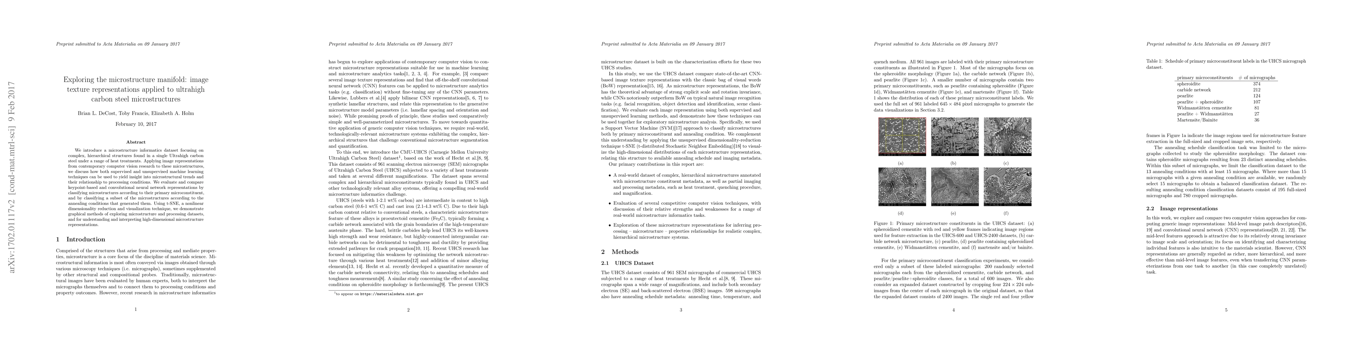 This paper introduces a dataset of ultrahigh carbon steel microstructures under various heat treatments, applying advanced image representations to analyze microstructural trends. It evaluates supervised and unsupervised machine learning techniques, comparing keypoint-based and convolutional neural network methods for classifying microstructures by their constituents and processing conditions, using t-SNE for visualization.