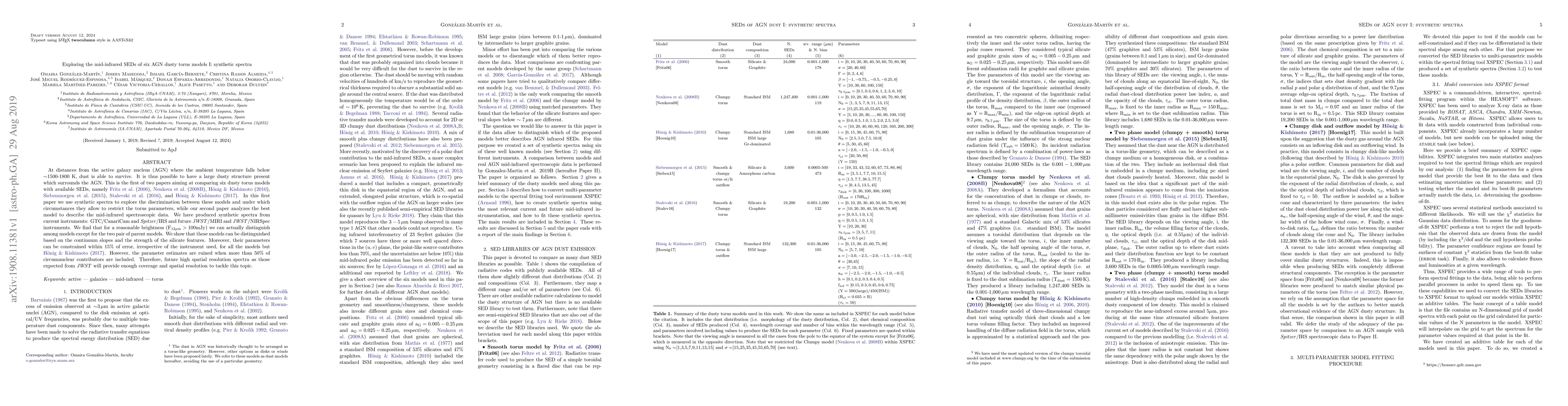 At distances from the active galaxy nucleus (AGN) where the ambient temperature falls below ~1500-1800 K, dust is able to survive. It is thus possible to have a large dusty structure present which surrounds the AGN. This is the first of two papers aiming at comparing six dusty torus models with available SEDs, namely Fritz et al. (2006), Nenkova et al. (2008B), Hoenig & Kishimoto (2010), Siebenmorgen et al. (2015), Stalevski et al. (2016), and Hoenig & Kishimoto (2017). In this first paper we use synthetic spectra to explore the discrimination between these models and under which circumstances they allow to restrict the torus parameters, while our second paper analyzes the best model to describe the mid-infrared spectroscopic data. We have produced synthetic spectra from current instruments: GTC/CanariCam and Spitzer /IRS and future JWST/MIRI and JWST/NIRSpec instruments. We find that for a reasonable brightness (F12um > 100mJy) we can actually distinguish among models except for the two pair of parent models. We show that these models can be distinguished based on the continuum slopes and the strength of the silicate features. Moreover, their parameters can be constrained within 15% of error, irrespective of the instrument used, for all the models but Hoenig & Kishimoto (2017). However, the parameter estimates are ruined when more than 50% of circumnuclear contributors are included. Therefore, future high spatial resolution spectra as those expected from JWST will provide enough coverage and spatial resolution to tackle this topic.