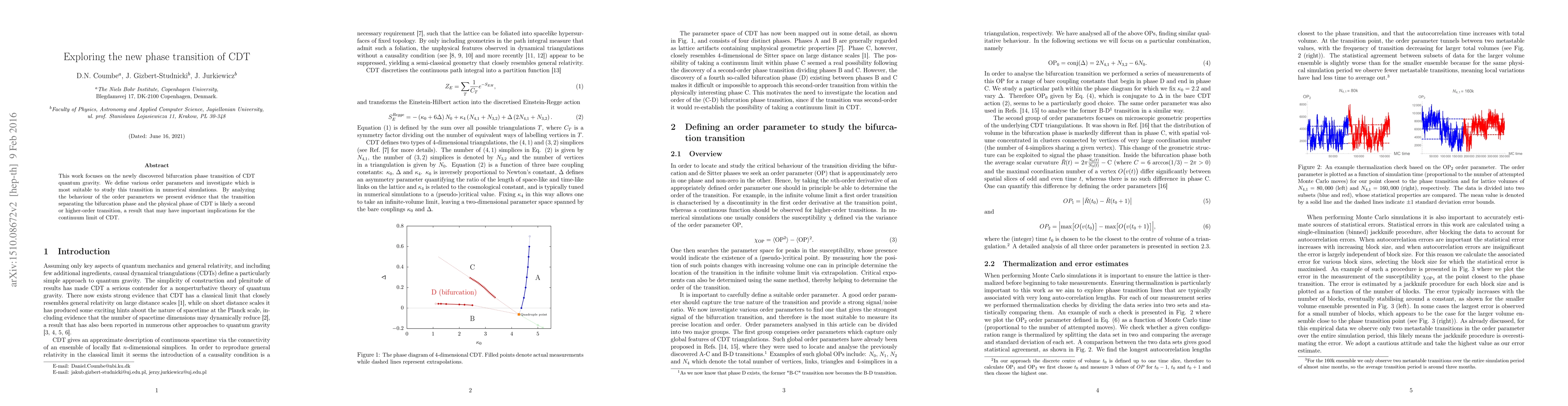 This research explores the newly identified bifurcation phase transition in CDT quantum gravity, identifying suitable order parameters for numerical simulations. Evidence suggests the transition separating the bifurcation phase and the physical phase is likely a second or higher-order transition, potentially impacting the continuum limit of CDT.