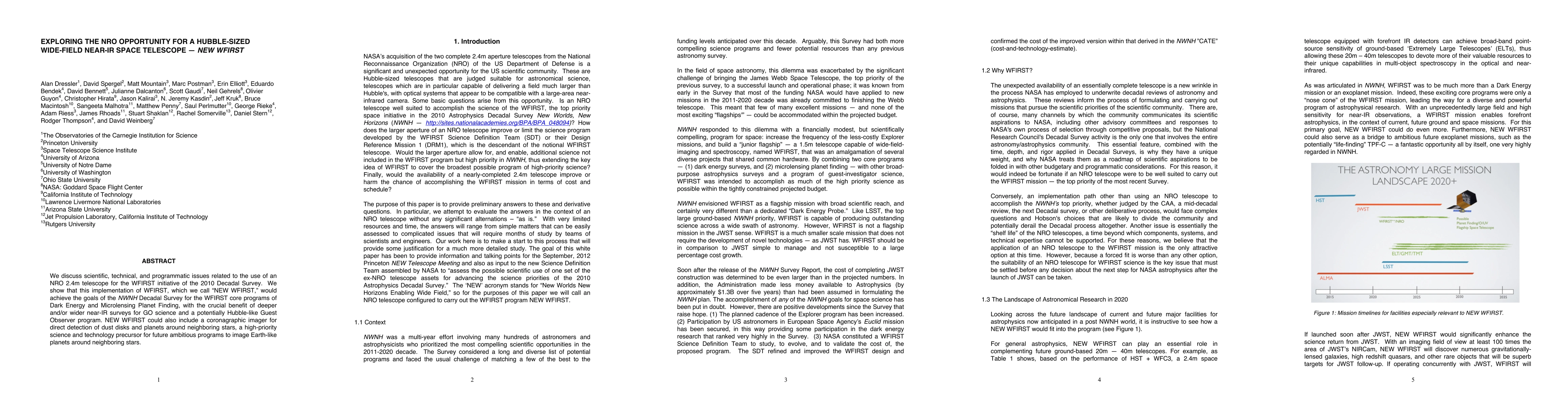 This paper explores the feasibility of a Hubble-sized wide-field near-IR space telescope, termed "NEW WFIRST," for the WFIRST initiative in the 2010 Decadal Survey, focusing on achieving goals for Dark Energy and microlensing planet finding, with enhanced near-IR surveys and a Hubble-like Guest Observer program. It also proposes a coronagraphic imager for direct detection of exoplanets and dust disks.