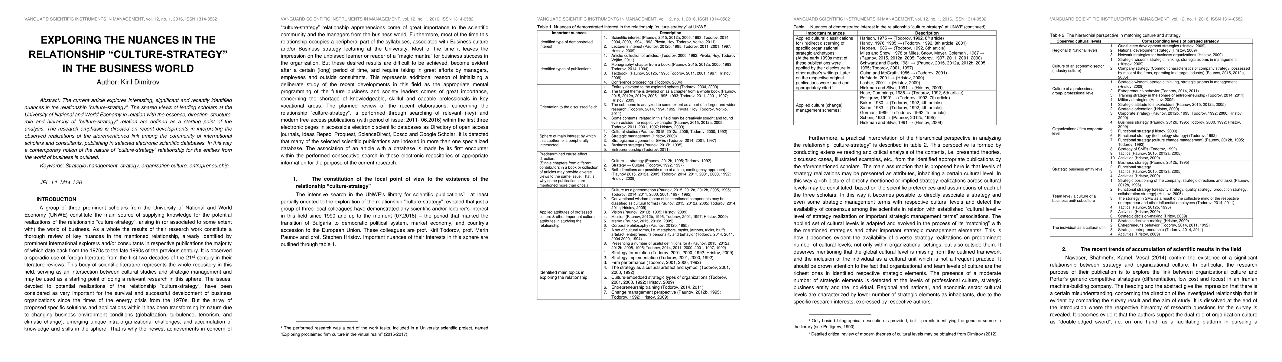 The current article explores interesting, significant and recently identified nuances in the relationship "culture-strategy". The shared views of leading scholars at the University of National and World Economy in relation with the essence, direction, structure, role and hierarchy of "culture-strategy" relation are defined as a starting point of the analysis. The research emphasis is directed on recent developments in interpreting the observed realizations of the aforementioned link among the community of international scholars and consultants, publishing in selected electronic scientific databases. In this way a contemporary notion of the nature of "culture-strategy" relationship for the entities from the world of business is outlined.