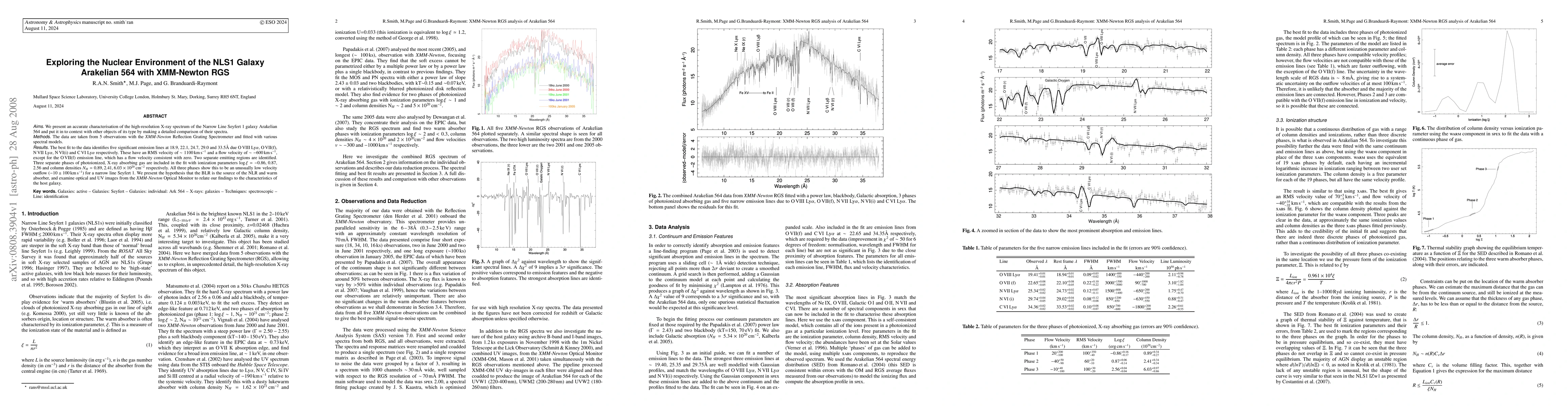 We present an accurate characterisation of the high-resolution X-ray spectrum of the Narrow Line Seyfert 1 galaxy Arakelian 564 and put it in to context with other objects of its type by making a detailed comparison of their spectra. The best fit to the data identifies five significant emission lines at 18.9, 22.1, 24.7, 29.0 and 33.5A due O VIII Ly alpha, O VII(f), N VII Ly alpha, N VI(i) and C VI Ly alpha respectively. These have an RMS velocity of ~1100km/s and a flow velocity of ~-600km/s, except for the O VII(f) emission line, which has a flow velocity consistent with zero. Two separate emitting regions are identified. Three separate phases of photoionized, X-ray absorbing gas are included in the fit with ionization parameters log xi=-0.86, 0.87, 2.56 and column densities N_H=0.89, 2.41, 6.03*10^20cm^-2 respectively. All three phases show this to be an unusually low velocity outflow (-10pm100km/s) for a narrow line Seyfert 1. We present the hypothesis that the BLR is the source of the NLR and warm absorber, and examine optical and UV images from the XMM-Newton Optical Monitor to relate our findings to the characteristics of the host galaxy.