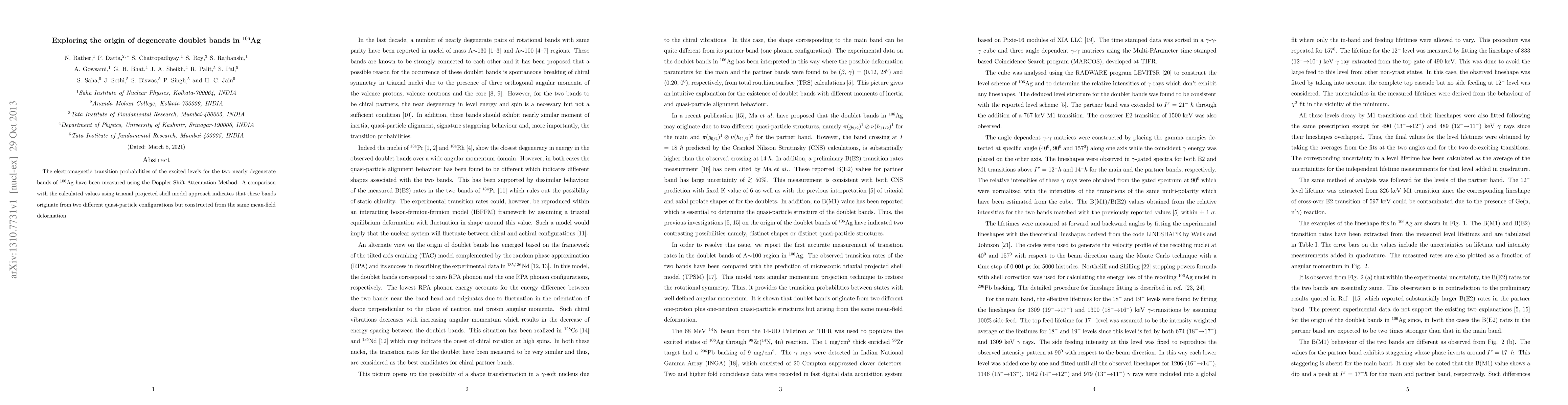 The electromagnetic transition probabilities of the excited levels for the two nearly degenerate bands of $^{106}$Ag have been measured using the Doppler Shift Attenuation Method. A comparison with the calculated values using triaxial projected shell model approach indicates that these bands originate from two different quasi-particle configurations but constructed from the same mean-field deformation.