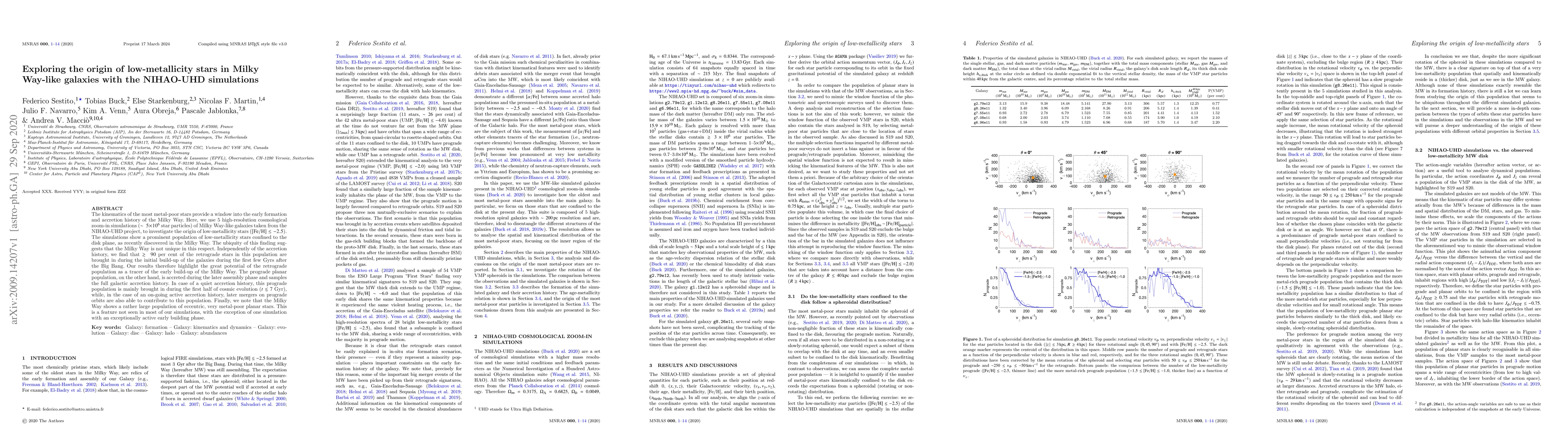 This study uses high-resolution NIHAO-UHD simulations to explore the origins of low-metallicity stars in Milky Way-like galaxies, finding that retrograde stars predominantly form during the initial galaxy build-up, while prograde stars are accreted later. The Milky Way's unique eccentric, metal-poor planar stars are rare in the simulations, suggesting a complex early assembly history.