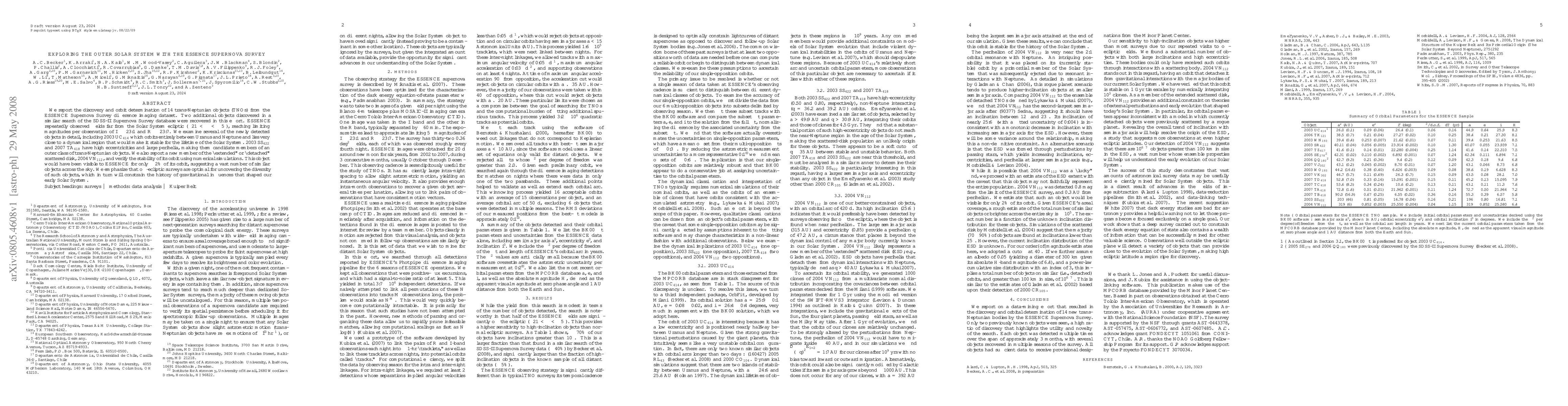 The ESSENCE Supernova Survey discovered 14 new trans-Neptunian objects (TNOs) and recovered two additional objects from the SDSS-II Supernova Survey, emphasizing the importance of off-ecliptic surveys for uncovering diverse TNOs and understanding the early Solar System's gravitational history. Among the discoveries, 2003 UC_414 orbits between Uranus and Neptune, while 2004 VN_112 is a new member of the extended scattered disk.