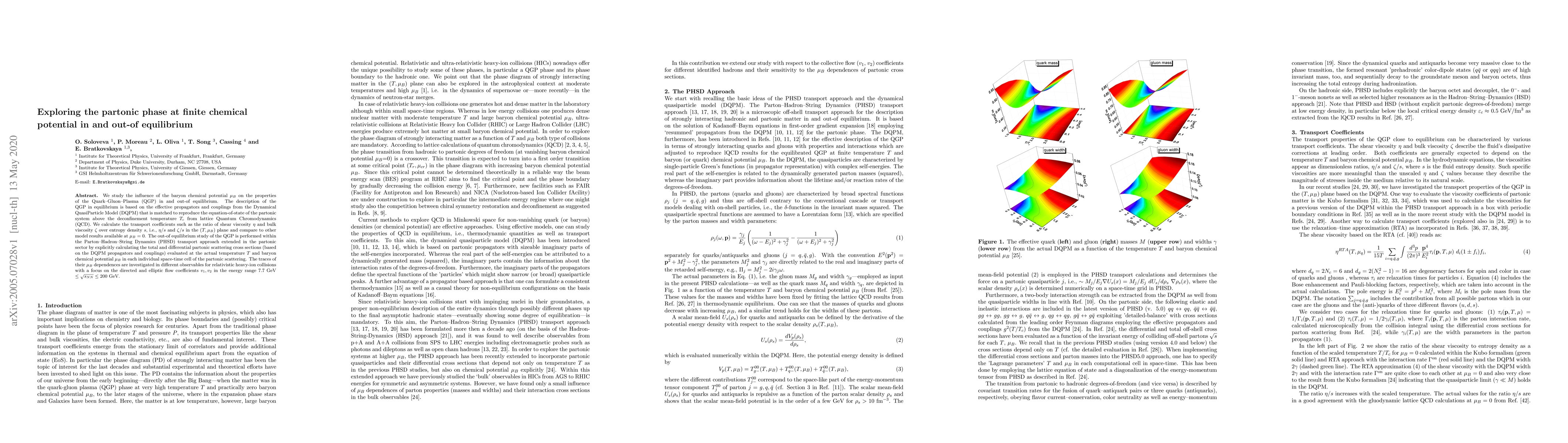 We study the influence of the baryon chemical potential $\mu_B$ on the properties of the Quark-Gluon-Plasma (QGP) in and out-of equilibrium. The description of the QGP in equilibrium is based on the effective propagators and couplings from the Dynamical QuasiParticle Model (DQPM) that is matched to reproduce the equation-of-state of the partonic system above the deconfinement temperature $T_c$ from lattice Quantum Chromodynamics (QCD). We calculate the transport coefficients such as the ratio of shear viscosity $\eta$ and bulk viscosity $\zeta$ over entropy density $s$, i.e., $\eta/s$ and $\zeta/s$ in the $(T,\mu_B)$ plane and compare to other model results available at $\mu_B =0$. The out-of equilibrium study of the QGP is performed within the Parton-Hadron-String Dynamics (PHSD) transport approach extended in the partonic sector by explicitly calculating the total and differential partonic scattering cross sections (based on the DQPM propagators and couplings) evaluated at the actual temperature $T$ and baryon chemical potential $\mu_B$ in each individual space-time cell of the partonic scattering. The traces of their $\mu_B$ dependences are investigated in different observables for relativistic heavy-ion collisions with a focus on the directed and elliptic flow coefficients $v_1, v_2$ in the energy range 7.7 GeV $\le \sqrt{s_{NN}}\le 200$ GeV.