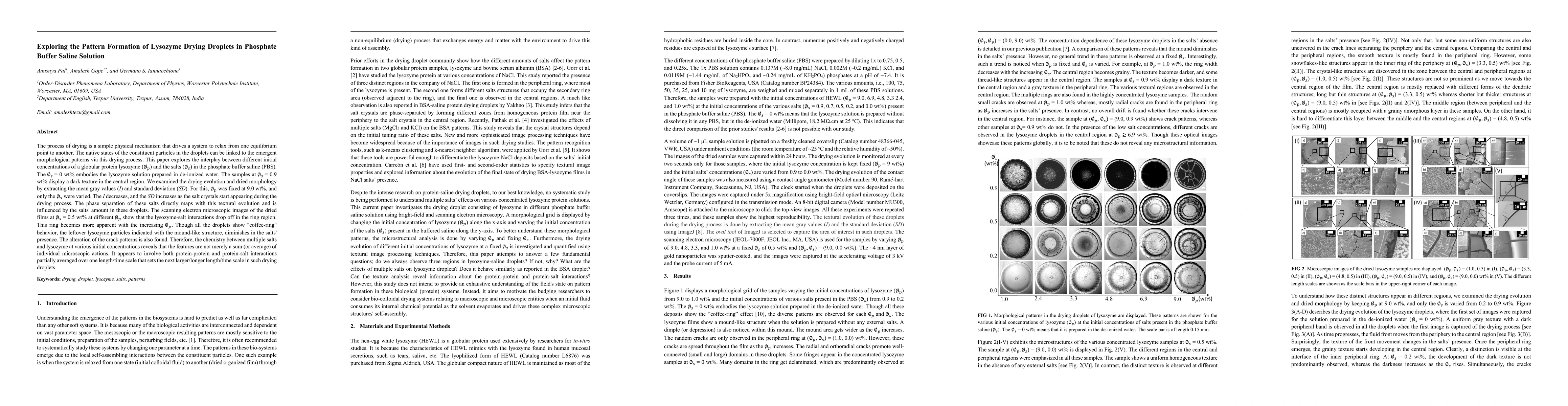 The process of drying is a simple physical mechanism that drives a system to relax from one equilibrium point to another. The native states of the constituent particles in the droplets can be linked to the emergent morphological patterns via this drying process. This paper explores the interplay between different initial concentrations of a globular protein lysozyme ($\phi_p$) and the salts ($\phi_s$) in the phosphate buffer saline (PBS). The $\phi_s$ = 0 wt% embodies the lysozyme solution prepared in de-ionized water. The samples at $\phi_s$ = 0.9 wt% display a dark texture in the central region. We examined the drying evolution and dried morphology by extracting the mean gray values (I) and standard deviation (SD). For this, $\phi_p$ was fixed at 9.0 wt%, and only the $\phi_s$ were varied. The I decreases, and the SD increases as the salt crystals start appearing during the drying process. The phase separation of these salts directly maps with this textural evolution and is influenced by the salts' amount in these droplets. The scanning electron microscopic images of the dried films at $\phi_s$ = 0.5 wt% at different $\phi_p$ show that the lysozyme-salt interactions drop off in the ring region. This ring becomes more apparent with the increasing $\phi_p$. Though all the droplets show "coffee-ring" behavior, the leftover lysozyme particles indicated with the mound-like structure diminishes in the salts' presence. The alteration of the crack patterns is also found. Therefore, the chemistry between multiple salts and lysozyme at various initial concentrations reveals that the features are not merely a sum (or average) of individual microscopic actions. It appears to involve both protein-protein and protein-salt interactions partially averaged over one length/time scale that sets the next larger/longer length/time scale in such drying droplets.