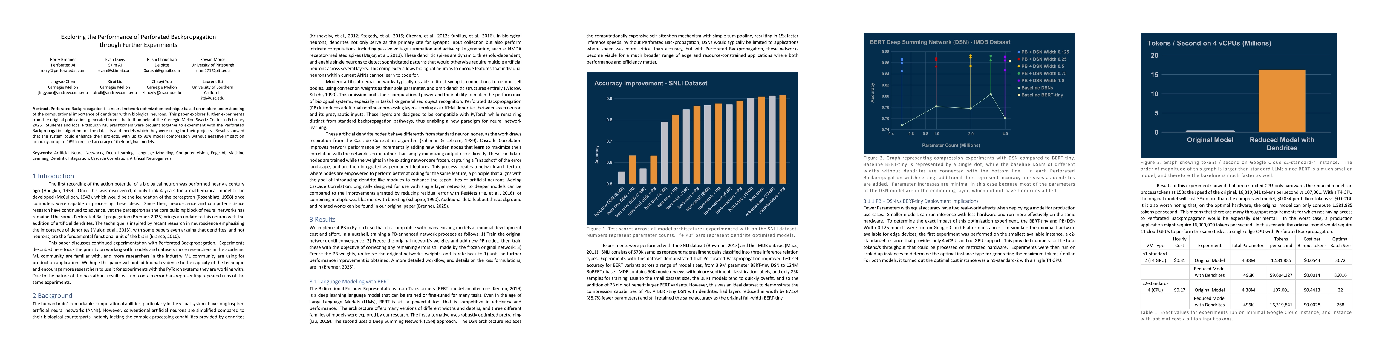 Perforated Backpropagation is a neural network optimization technique based on modern understanding of the computational importance of dendrites within biological neurons. This paper explores further experiments from the original publication, generated from a hackathon held at the Carnegie Mellon Swartz Center in February 2025. Students and local Pittsburgh ML practitioners were brought together to experiment with the Perforated Backpropagation algorithm on the datasets and models which they were using for their projects. Results showed that the system could enhance their projects, with up to 90% model compression without negative impact on accuracy, or up to 16% increased accuracy of their original models.