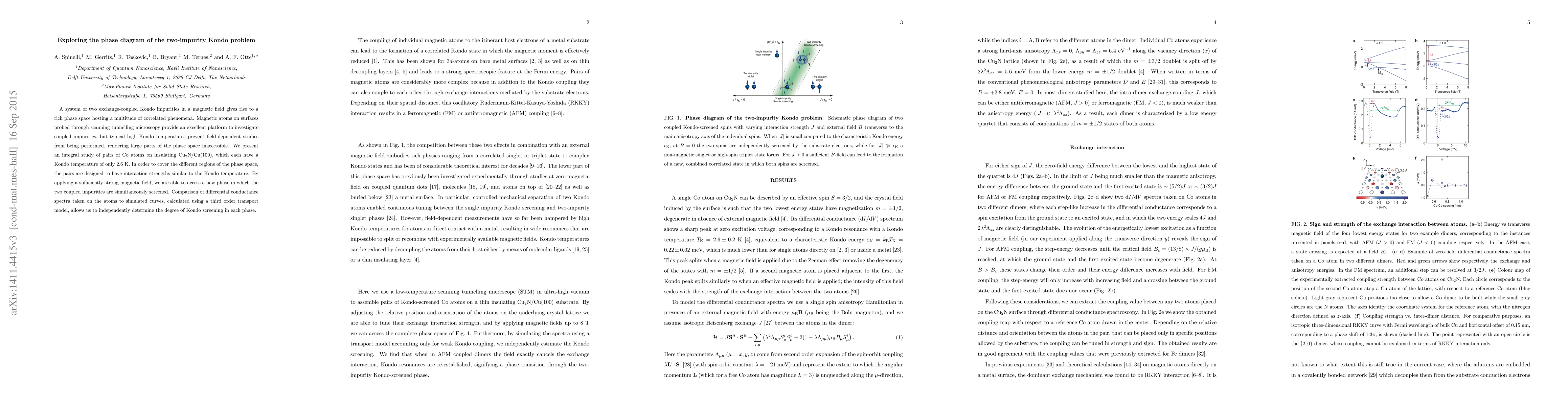 A system of two exchange-coupled Kondo impurities in a magnetic field gives rise to a rich phase space hosting a multitude of correlated phenomena. Magnetic atoms on surfaces probed through scanning tunnelling microscopy provide an excellent platform to investigate coupled impurities, but typical high Kondo temperatures prevent field-dependent studies from being performed, rendering large parts of the phase space inaccessible. We present an integral study of pairs of Co atoms on insulating Cu2N/Cu(100), which each have a Kondo temperature of only 2.6 K. In order to cover the different regions of the phase space, the pairs are designed to have interaction strengths similar to the Kondo temperature. By applying a sufficiently strong magnetic field, we are able to access a new phase in which the two coupled impurities are simultaneously screened. Comparison of differential conductance spectra taken on the atoms to simulated curves, calculated using a third order transport model, allows us to independently determine the degree of Kondo screening in each phase.