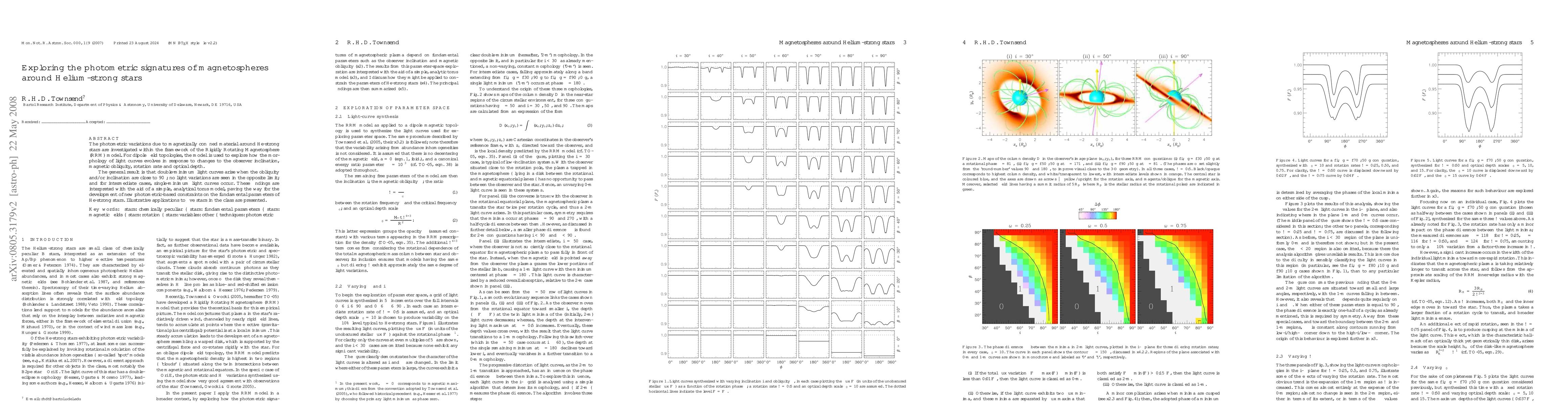 The photometric variations due to magnetically confined material around He-strong stars are investigated within the framework of the Rigidly Rotating Magnetosphere (RRM) model. For dipole field topologies, the model is used to explore how the morphology of light curves evolves in response to changes to the observer inclination, magnetic obliquity, rotation rate and optical depth. The general result is that double-minimum light curves arise when the obliquity and/or inclination are close to 90 degrees; no light variations are seen in the opposite limit; and for intermediate cases, single-minimum light curves occur. These findings are interpreted with the aid of a simple, analytical torus model, paving the way for the development of new photometric-based constraints on the fundamental parameters of He-strong stars. Illustrative applications to five stars in the class are presented.