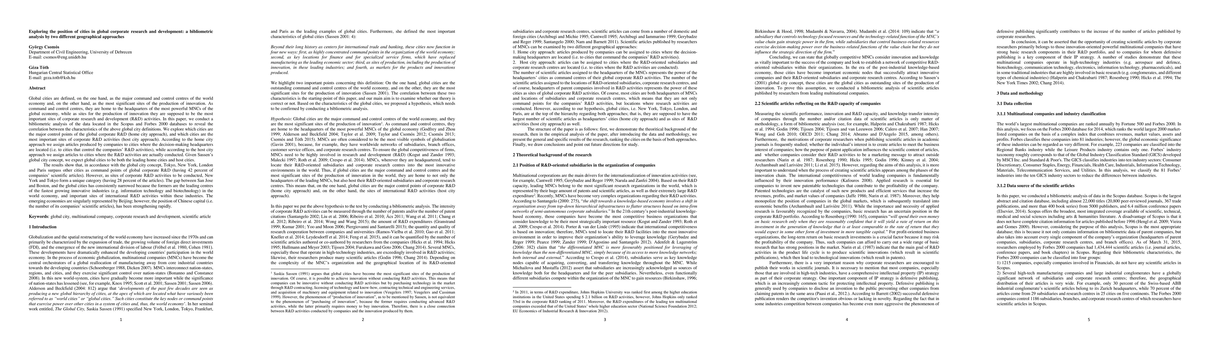 Global cities are defined, on the one hand, as the major command and control centres of the world economy and, on the other hand, as the most significant sites of the production of innovation. As command and control centres, they are home to the headquarters of the most powerful MNCs of the global economy, while as sites for the production of innovation they are supposed to be the most important sites of corporate research and development (R&D) activities. In this paper, we conduct a bibliometric analysis of the data located in the Scopus and Forbes 2000 databases to reveal the correlation between the characteristics of the above global city definitions. We explore which cities are the major control points of the global corporate R&D (home city approach), and which cities are the most important sites of corporate R&D activities (host city approach). According to the home city approach we assign articles produced by companies to cities where the decision-making headquarters are located (i.e. to cities that control the companies' R&D activities), while according to the host city approach we assign articles to cities where the R&D activities are actually conducted. Given Sassen's global city concept, we expect global cities to be both the leading home cities and host cities.