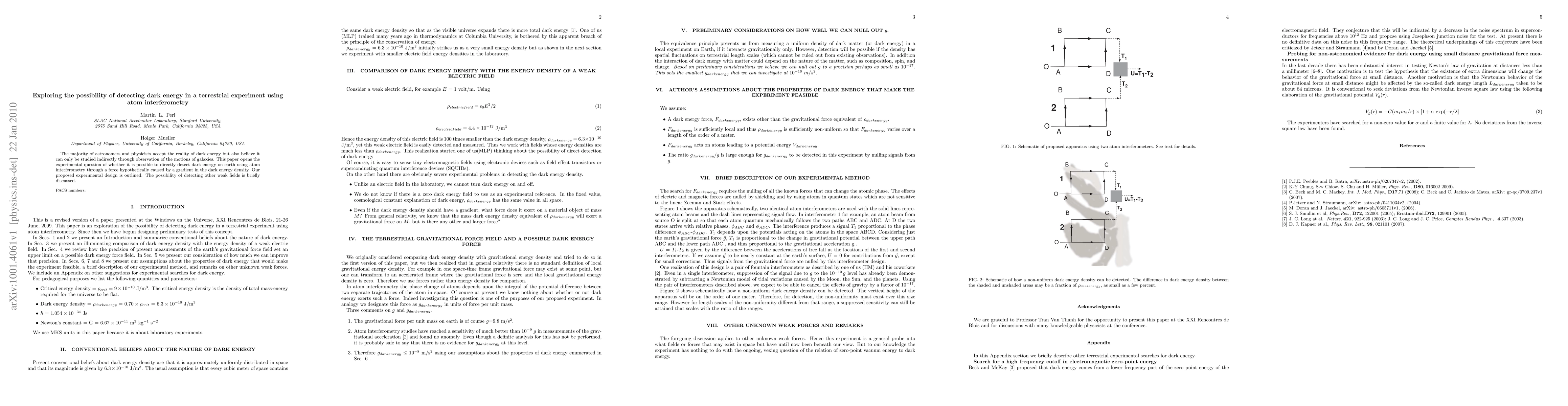 This paper investigates the feasibility of detecting dark energy directly on Earth using atom interferometry, proposing an experimental design to measure a hypothetical force from dark energy density gradients. It also briefly considers the potential for detecting other weak fields.