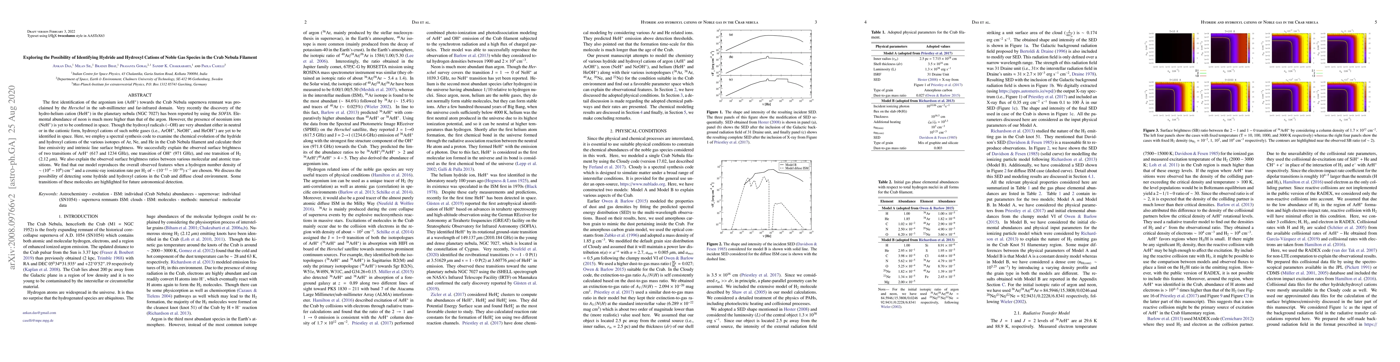 This study uses a spectral synthesis code to model the chemical evolution of hydride and hydroxyl cations of Ar, Ne, and He in the Crab Nebula. It successfully explains observed surface brightnesses of ArH+, OH+, and H2 transitions, suggesting a hydrogen number density of ~10^4-10^6 cm^-3 and a cosmic-ray ionization rate per H2 of ~10^-11-10^-10 s^-1. The paper highlights potential transitions for future detection of these cations in space environments.