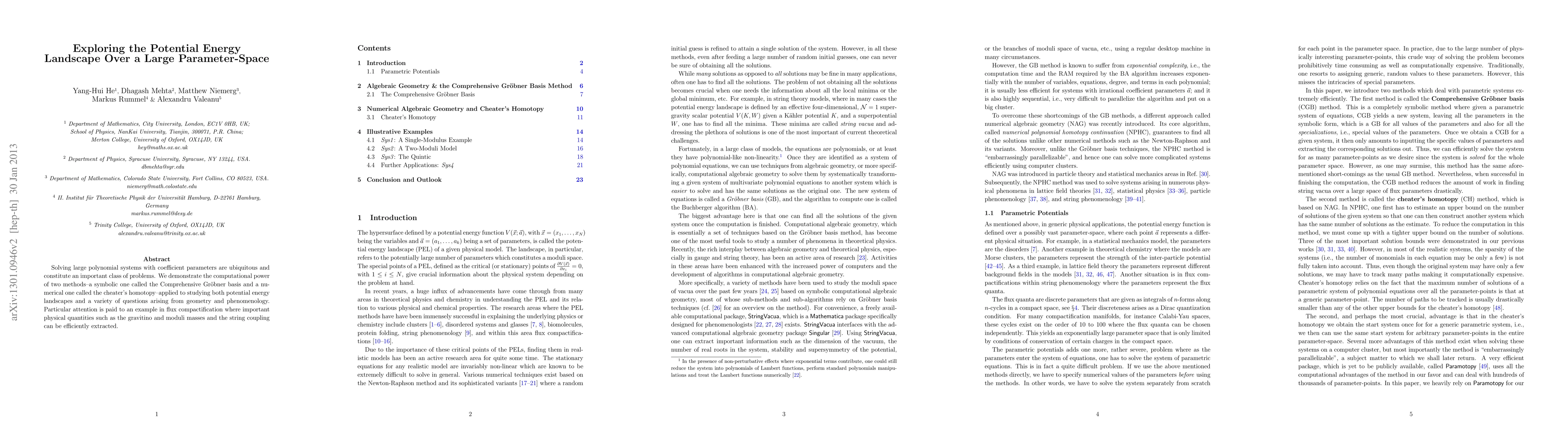 Solving large polynomial systems with coefficient parameters are ubiquitous and constitute an important class of problems. We demonstrate the computational power of two methods--a symbolic one called the Comprehensive Gr\"obner basis and a numerical one called the cheater's homotopy-applied to studying both potential energy landscapes and a variety of questions arising from geometry and phenomenology. Particular attention is paid to an example in flux compactification where important physical quantities such as the gravitino and moduli masses and the string coupling can be efficiently extracted.