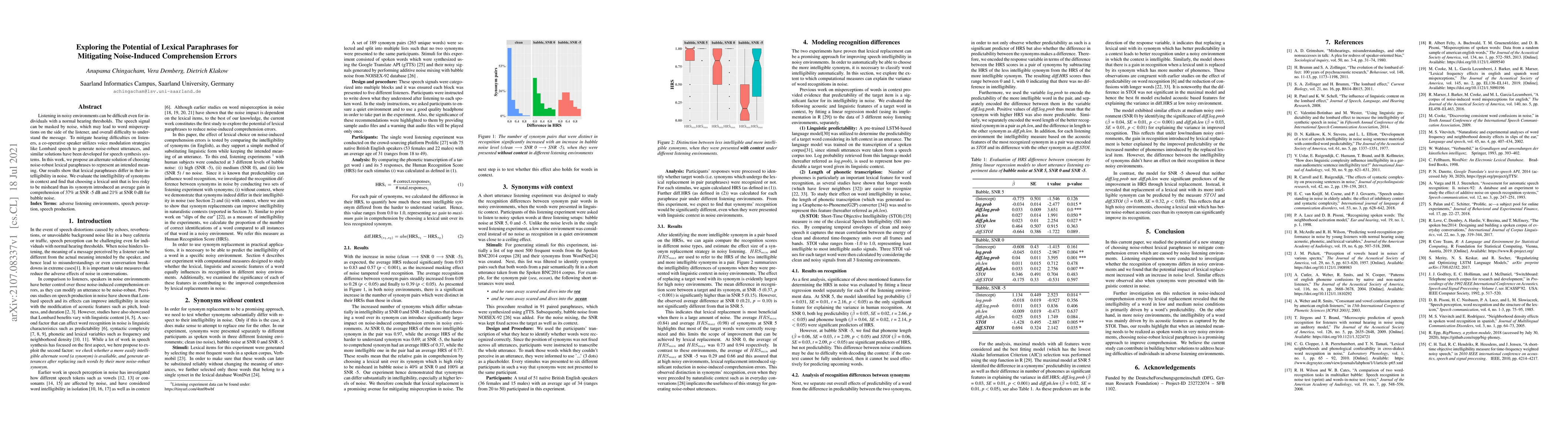 This paper explores using lexical paraphrases to improve comprehension in noisy environments, finding that certain paraphrases are more intelligible than others, leading to an average comprehension gain of 37% at SNR -5 dB and 21% at SNR 0 dB for babble noise.