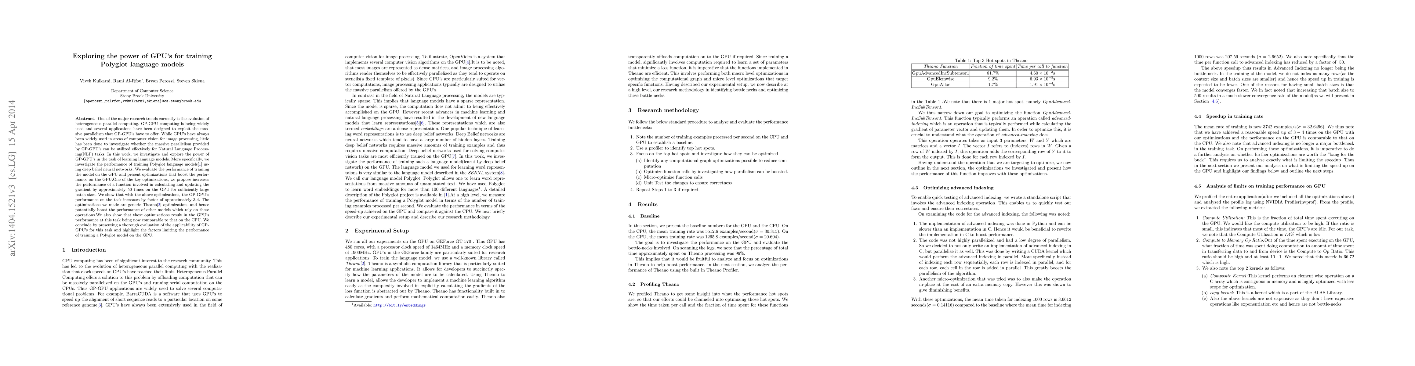 One of the major research trends currently is the evolution of heterogeneous parallel computing. GP-GPU computing is being widely used and several applications have been designed to exploit the massive parallelism that GP-GPU's have to offer. While GPU's have always been widely used in areas of computer vision for image processing, little has been done to investigate whether the massive parallelism provided by GP-GPU's can be utilized effectively for Natural Language Processing(NLP) tasks. In this work, we investigate and explore the power of GP-GPU's in the task of learning language models. More specifically, we investigate the performance of training Polyglot language models using deep belief neural networks. We evaluate the performance of training the model on the GPU and present optimizations that boost the performance on the GPU.One of the key optimizations, we propose increases the performance of a function involved in calculating and updating the gradient by approximately 50 times on the GPU for sufficiently large batch sizes. We show that with the above optimizations, the GP-GPU's performance on the task increases by factor of approximately 3-4. The optimizations we made are generic Theano optimizations and hence potentially boost the performance of other models which rely on these operations.We also show that these optimizations result in the GPU's performance at this task being now comparable to that on the CPU. We conclude by presenting a thorough evaluation of the applicability of GP-GPU's for this task and highlight the factors limiting the performance of training a Polyglot model on the GPU.