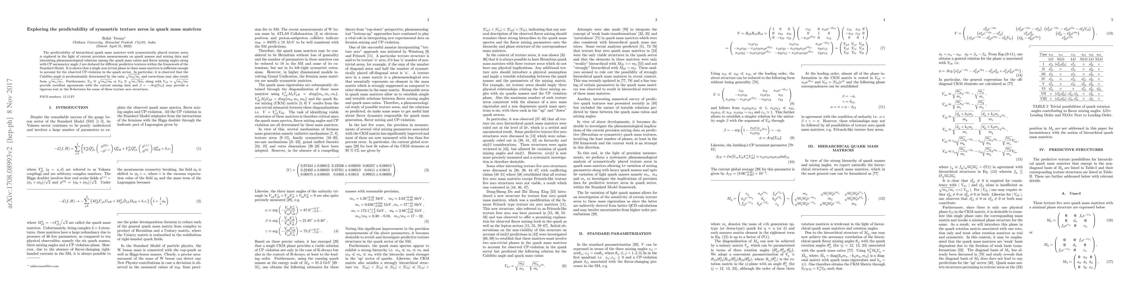 The predictability of hierarchical quark mass matrices with symmetrically placed texture zeros is explored in the light of current precision measurements on quark masses and mixing data and interesting phenomenological relations among the quark mass ratios and flavor mixing angles along with CP asymmetry angle $\beta$ are deduced for different predictive textures within the framework of the Standard Model. It is shown that a single non-trivial phase in these mass matrices is sufficient enough to account for the observed CP-violation in the quark sector. In particular, it is observed that the Cabibbo angle is predominantly determined by the ratio $\sqrt{m_{d}/m_{s}}$ and corrections may also result from $\sqrt{m_{u}/m_{c}}$. Furthermore, $V_{cb}\cong \sqrt{m_d/m_b}$ or $V_{cb}\cong \sqrt{m_c/2m_t}$ along with $V_{ub}\simeq \sqrt{m_u/m_t}$ provide excellent agreements with the current mixing data and $\beta =-Arg\lbrace V_{td}\rbrace$ may provide a rigorous test at the B-factories for some of these texture zero structures.