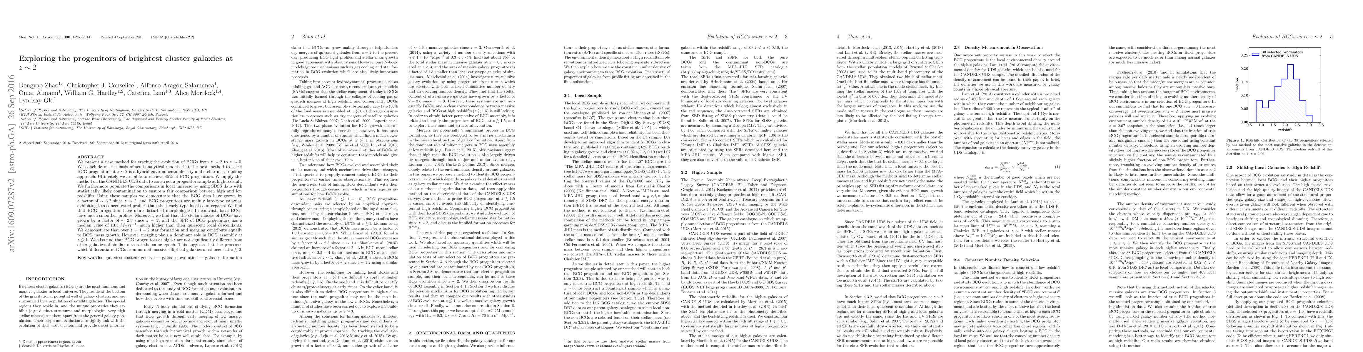 This paper introduces a new method to trace the evolution of brightest cluster galaxies (BCGs) from $z\sim 2$ to $z\sim 0$ using a hybrid approach based on environmental density and stellar mass. It finds that BCG progenitors at high redshift are mainly late-type galaxies with more disturbed morphologies and higher star formation rates compared to their local counterparts.