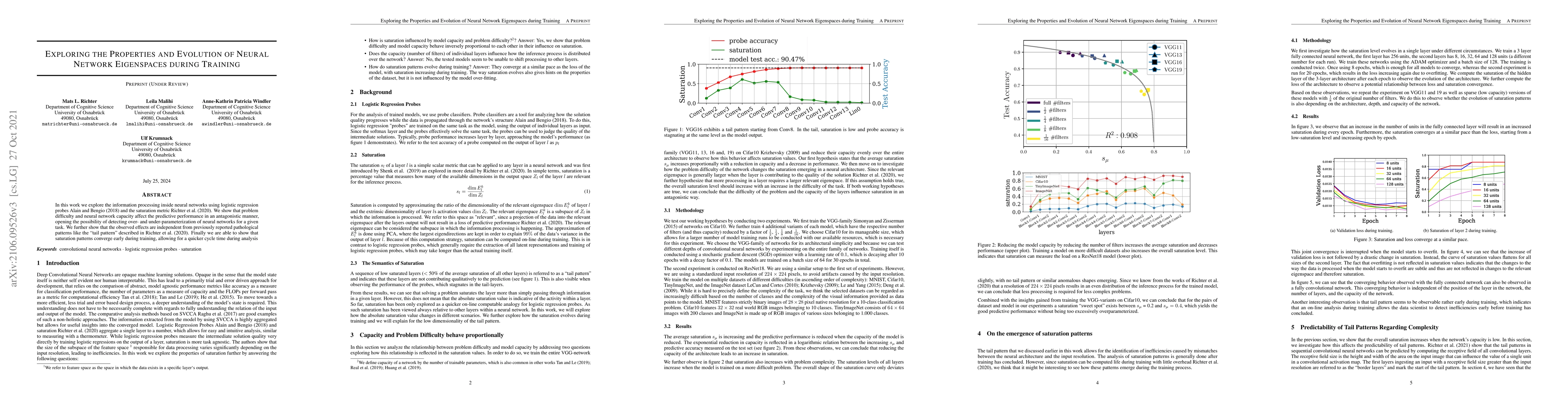 In this work we explore the information processing inside neural networks using logistic regression probes \cite{probes} and the saturation metric \cite{featurespace_saturation}. We show that problem difficulty and neural network capacity affect the predictive performance in an antagonistic manner, opening the possibility of detecting over- and under-parameterization of neural networks for a given task. We further show that the observed effects are independent from previously reported pathological patterns like the ``tail pattern'' described in \cite{featurespace_saturation}. Finally we are able to show that saturation patterns converge early during training, allowing for a quicker cycle time during analysis