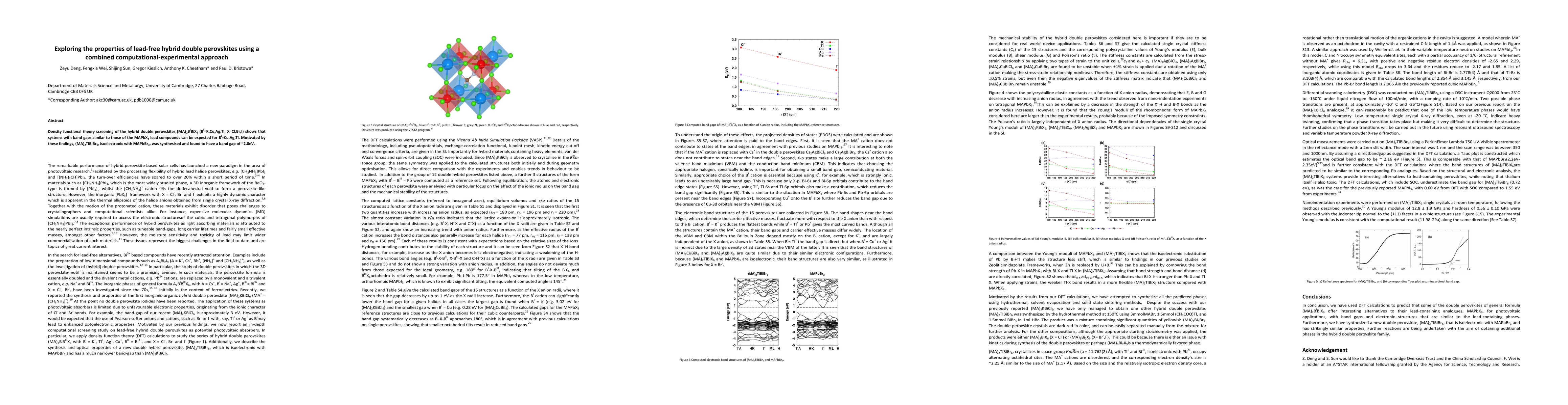 This research combines computational and experimental methods to explore lead-free hybrid double perovskites, identifying (MA)2TlBiBr6 as a promising candidate with a band gap comparable to lead-based perovskites. Experimental synthesis confirms its band gap of ~2.0 eV, aligning with theoretical predictions.