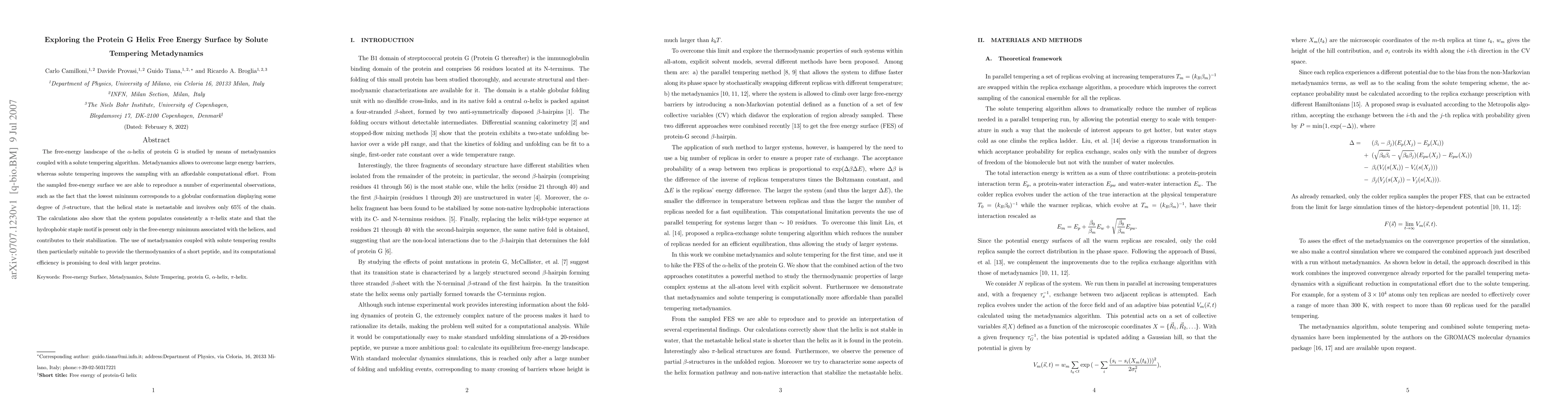 This study uses metadynamics with solute tempering to explore the free energy landscape of protein G's alpha-helix, revealing a metastable helical state and a pi-helix state, while confirming the presence of a hydrophobic staple motif in the helices' stabilization. The method's efficiency promises its applicability to larger proteins.