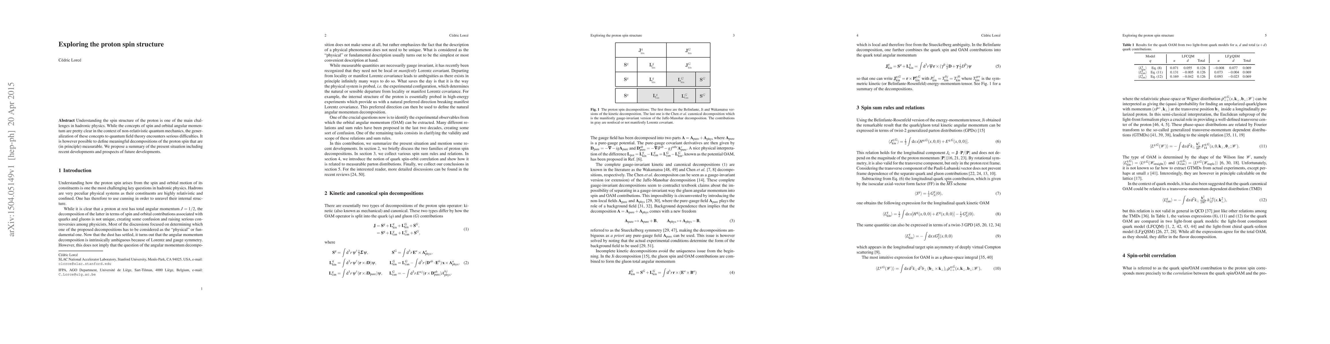 Understanding the spin structure of the proton is one of the main challenges in hadronic physics. While the concepts of spin and orbital angular momentum are pretty clear in the context of non-relativistic quantum mechanics, the generalization of these concepts to quantum field theory encounters serious difficulties. It is however possible to define meaningful decompositions of the proton spin that are (in principle) measurable. We propose a summary of the present situation including recent developments and prospects of future developments.