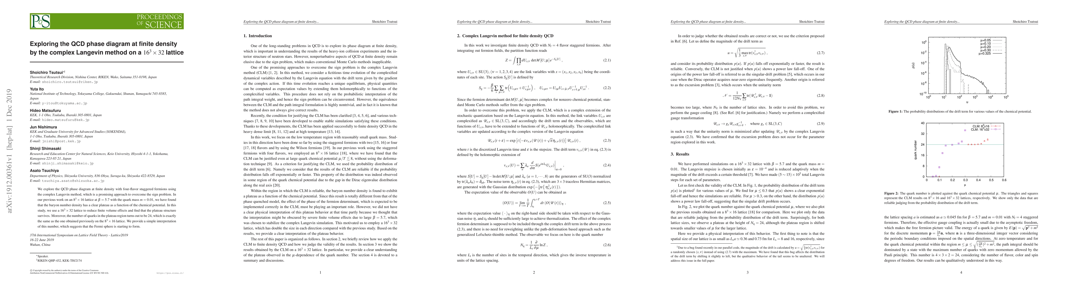 This paper investigates the QCD phase diagram at finite density using the complex Langevin method on a larger $16^3 \times 32$ lattice. The study confirms the presence of a plateau in baryon number density, consistent with previous findings on a smaller lattice, suggesting the onset of Fermi sphere formation.
