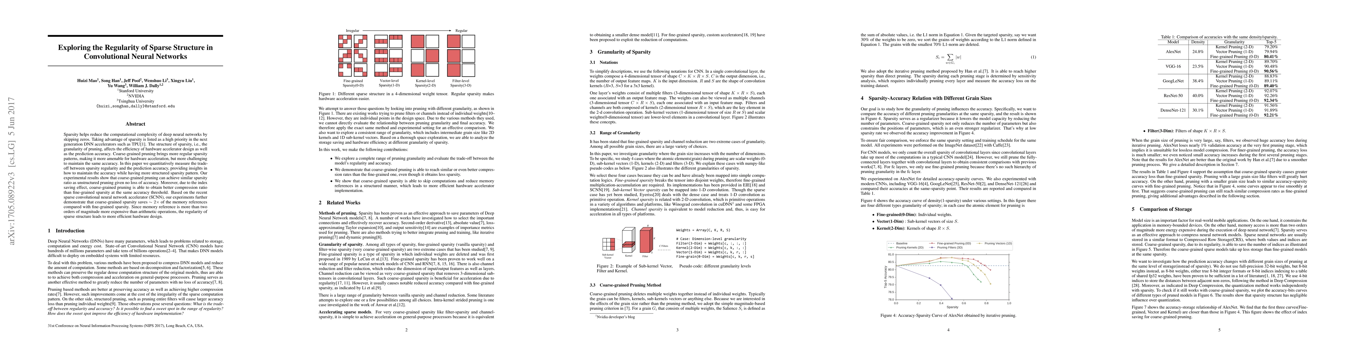 This paper investigates the trade-off between the regularity of sparsity patterns in convolutional neural networks and prediction accuracy, demonstrating that coarse-grained pruning maintains accuracy while achieving higher sparsity ratios and better compression ratios compared to fine-grained pruning. The study highlights that structured sparsity patterns enable more efficient hardware accelerators.