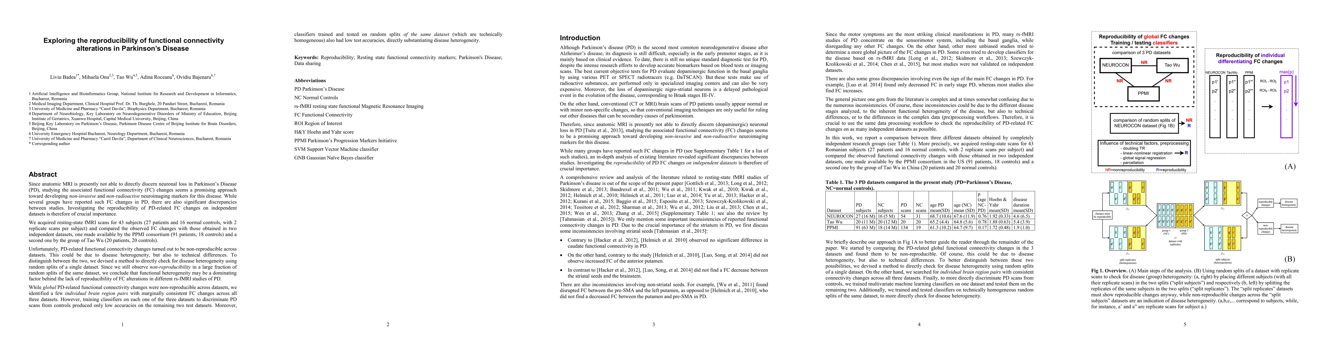 Since anatomic MRI is presently not able to directly discern neuronal loss in Parkinson's Disease (PD), studying the associated functional connectivity (FC) changes seems a promising approach toward developing non-invasive and non-radioactive neuroimaging markers for this disease. While several groups have reported such FC changes in PD, there are also significant discrepancies between studies. Investigating the reproducibility of PD-related FC changes on independent datasets is therefore of crucial importance. We acquired resting-state fMRI scans for 43 subjects (27 patients , 16 controls) and compared the observed FC changes with those obtained in 2 independent datasets, one made available by the PPMI consortium and a second one by the group of Tao Wu. Unfortunately, PD-related functional connectivity changes turned out to be non-reproducible across datasets. This could be due to disease heterogeneity, but also to technical differences. To distinguish between the two, we devised a method to directly check for disease heterogeneity using random splits of a single dataset. Since we still observe non-reproducibility in a large fraction of random splits of the same dataset, we conclude that functional heterogeneity may be a dominating factor behind the lack of reproducibility of FC alterations in different rs-fMRI studies of PD. While global PD-related functional connectivity changes were non-reproducible across datasets, we identified a few individual brain region pairs with marginally consistent FC changes across all three datasets. However, training classifiers on each one of the 3 datasets to discriminate PD scans from controls produced only low accuracies on the remaining two test datasets. Moreover, classifiers trained and tested on random splits of the same dataset (which are technically homogeneous) also had low test accuracies, directly substantiating disease heterogeneity.