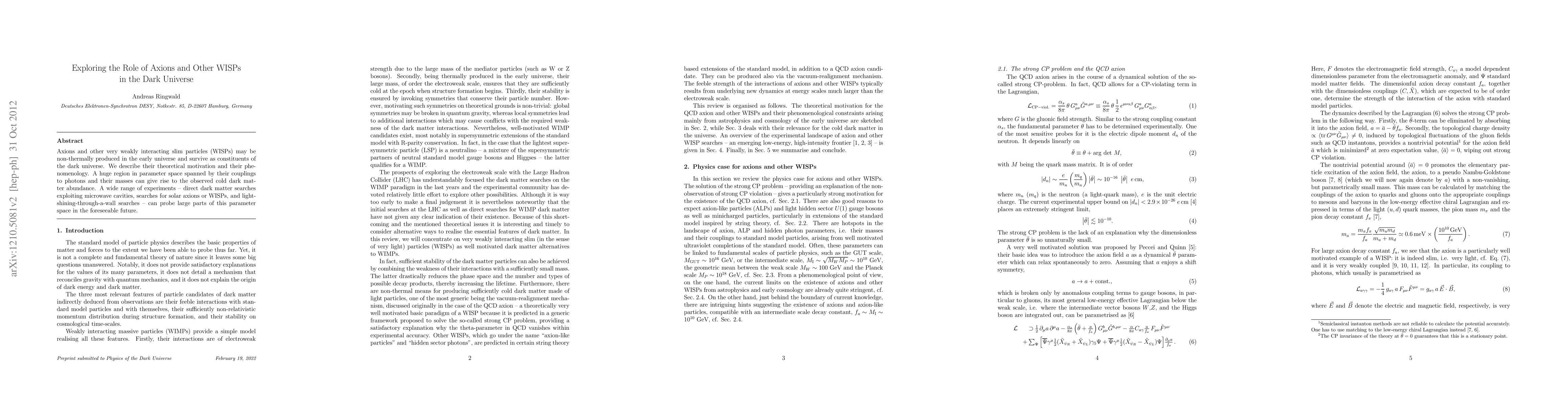 This paper explores the potential role of axions and other very weakly interacting slim particles (WISPs) as constituents of cold dark matter, detailing their theoretical basis and phenomenology. It highlights the experimental avenues, including direct searches and light-shining-through-a-wall experiments, that could probe the parameter space for these particles.