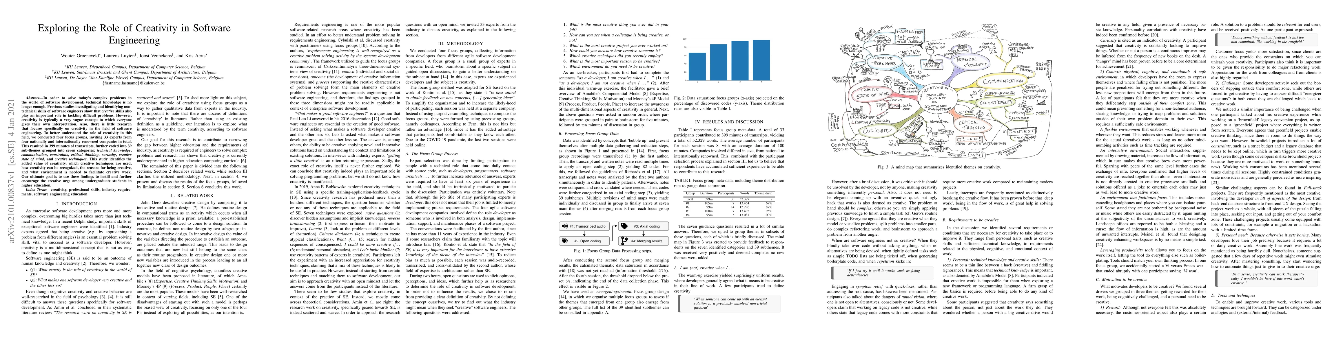 In order to solve today's complex problems in the world of software development, technical knowledge is no longer enough. Previous studies investigating and identifying non-technical skills of software engineers show that creative skills also play an important role in tackling difficult problems. However, creativity is typically a very vague concept to which everyone gives their own interpretation. Also, there is little research that focuses specifically on creativity in the field of software engineering. To better understand the role of creativity in this field, we conducted four focus groups, inviting 33 experts from four nationally and internationally renowned companies in total. This resulted in 399 minutes of transcripts, further coded into 39 sub-themes grouped into seven categories: technical knowledge, communication, constraints, critical thinking, curiosity, creative state of mind, and creative techniques. This study identifies the added value of creativity, which creative techniques are used, how creativity can be recognized, the reasons for being creative, and what environment is needed to facilitate creative work. Our ultimate goal is to use these findings to instill and further encourage the creative urge among undergraduate students in higher education.