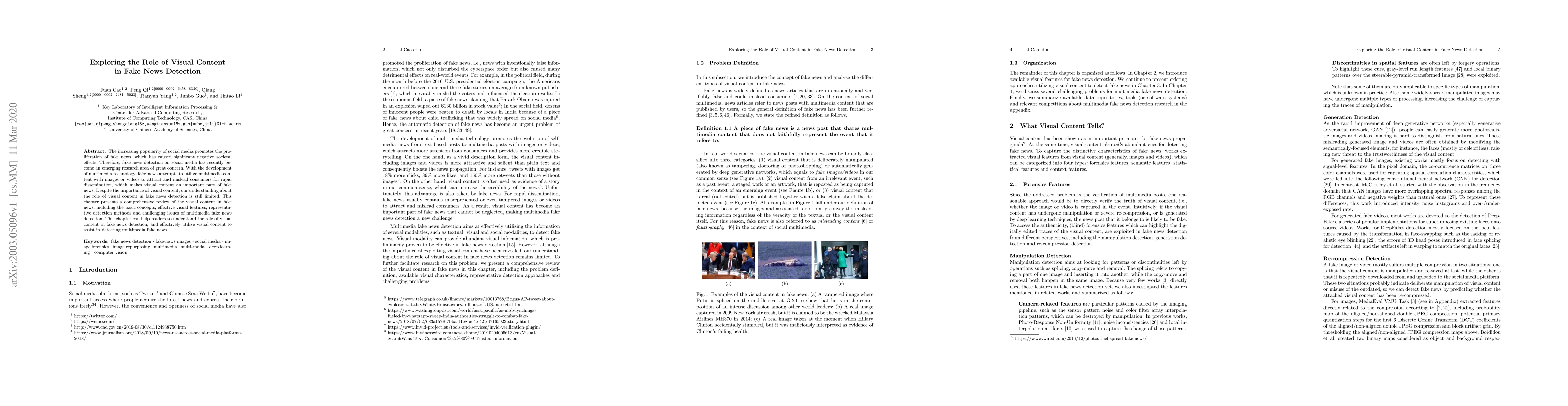 The increasing popularity of social media promotes the proliferation of fake news, which has caused significant negative societal effects. Therefore, fake news detection on social media has recently become an emerging research area of great concern. With the development of multimedia technology, fake news attempts to utilize multimedia content with images or videos to attract and mislead consumers for rapid dissemination, which makes visual content an important part of fake news. Despite the importance of visual content, our understanding of the role of visual content in fake news detection is still limited. This chapter presents a comprehensive review of the visual content in fake news, including the basic concepts, effective visual features, representative detection methods and challenging issues of multimedia fake news detection. This chapter can help readers to understand the role of visual content in fake news detection, and effectively utilize visual content to assist in detecting multimedia fake news.