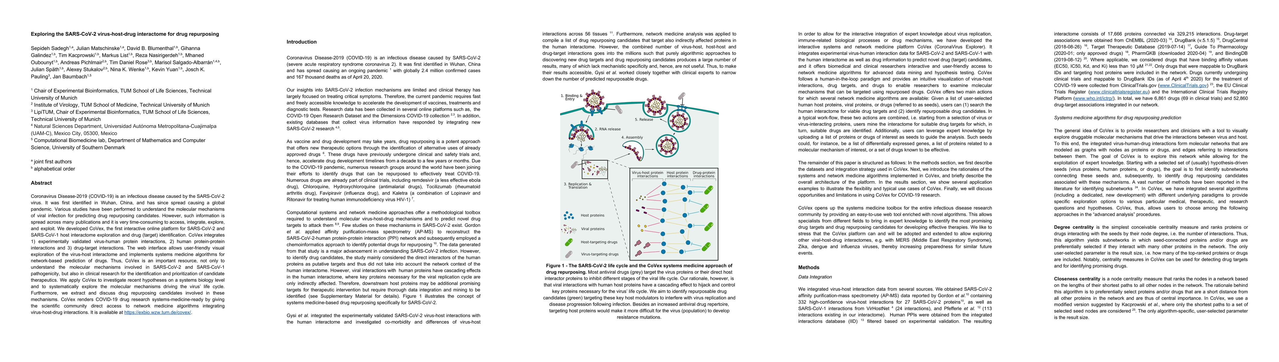 This paper introduces CoVex, an interactive online platform for exploring SARS-CoV-2 and SARS-CoV-1 virus-host interactions and identifying drug targets. It integrates validated virus-human protein interactions, human protein-protein interactions, and drug-target interactions, facilitating systems medicine approaches for drug repurposing and understanding viral pathogenicity.